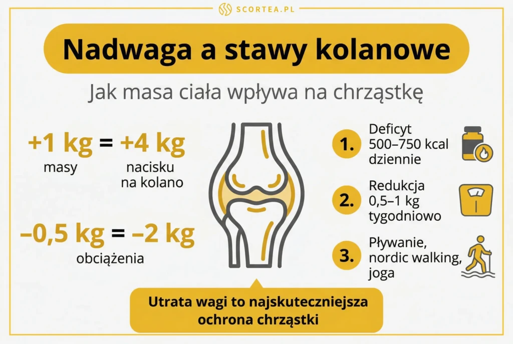 Każdy dodatkowy kilogram masy ciała generuje 4 kg dodatkowego nacisku na kolano przy każdym kroku. Nadmiar tkanki tłuszczowej prowadzi do mikrourazów chrząstki, które – przy braku regeneracji – kumulują się w pęknięcia i ubytki. Zrzucenie już 0,5 kg zmniejsza nacisk na kolano o 2 kg przy każdym kroku, uruchamiając procesy naprawcze chrząstki.