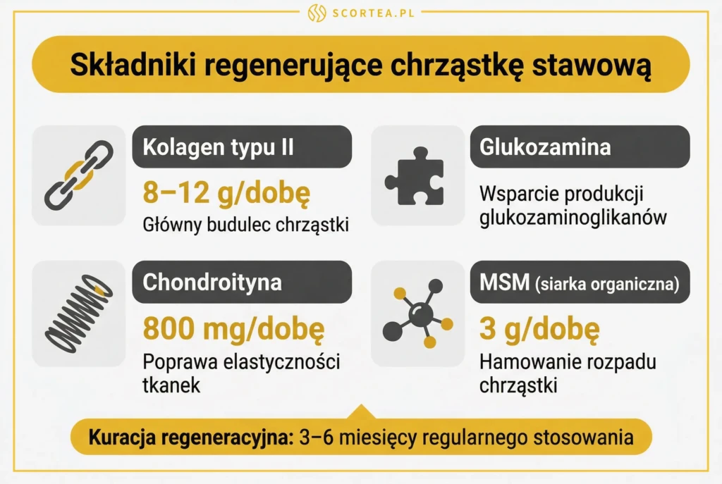 Kolagen hydrolizowany to inna opcja. Zalecana dawka to od 8 do 12 gramów dziennie. Taka ilość stymuluje chondrocyty do produkcji składników macierzy i naprawy mikrourazów. Regularne dostarczanie tych składników pozwala chrząstce odzyskać gęstość, co zmniejsza dyskomfort podczas aktywności fizycznej.