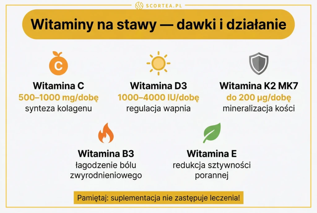 Najważniejsze witaminy na stawy to C, D3, K2MK7, E i B3. Witamina C (500-1000 mg/dobę) jest niezbędna do syntezy kolagenu, D3 (1000-4000 IU) reguluje gospodarkę wapniową, K2MK7 kieruje wapń do kości a nie do tkanek miękkich, E chroni chrząstkę przed stresem oksydacyjnym, a B3 (niacyna) łagodzi ból w chorobie zwyrodnieniowej.