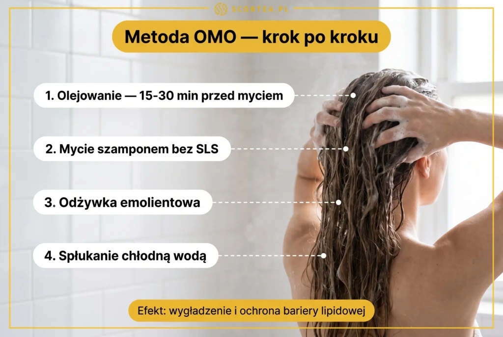 Metoda OMO to sposób mycia włosów, który chroni je przed wysuszającym działaniem detergentów. Jest szczególnie polecana dla włosów średnioporowatych, ponieważ pomaga utrzymać ich naturalną wilgotność, jednocześnie skutecznie oczyszczając skórę głowy. Dzięki tej metodzie zmniejsza się ryzyko mechanicznych uszkodzeń i przesuszeń, co jest istotne dla włosów o lekko rozchylonych łuskach.