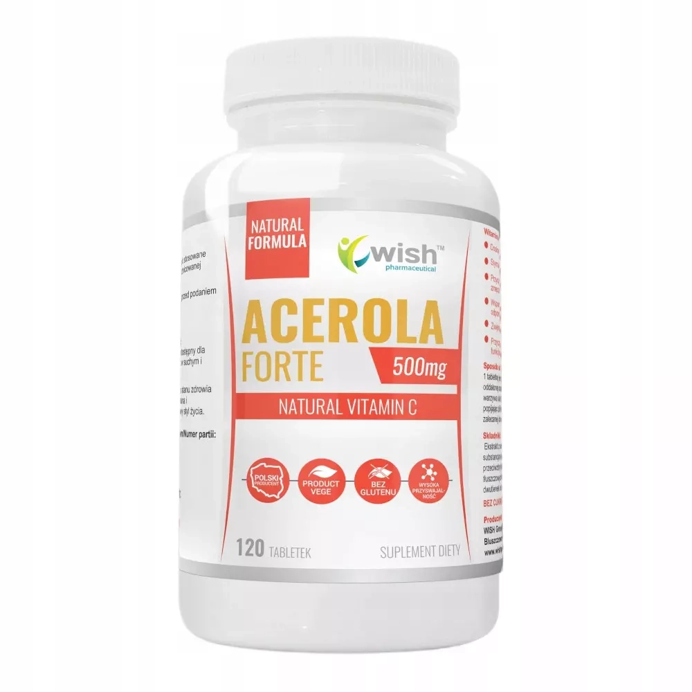 Acerola Forte marki Wish to naturalne źródło dobrze przyswajalnej witaminy C. Owoce aceroli, znane również jako wiśnie z Barbados biją rekordy pod względem zawartości tej cennej witaminy, która odgrywa kluczową rolę w wielu procesach metabolicznych. Wspiera ona zdrowie skóry i chroni organizm przed działaniem szkodliwych wolnych rodników. Dzięki Acerola Forte codzienna suplementacja staje się przyjemnością, która pomaga chronić i wzmacniać Twój organizm każdego dnia.