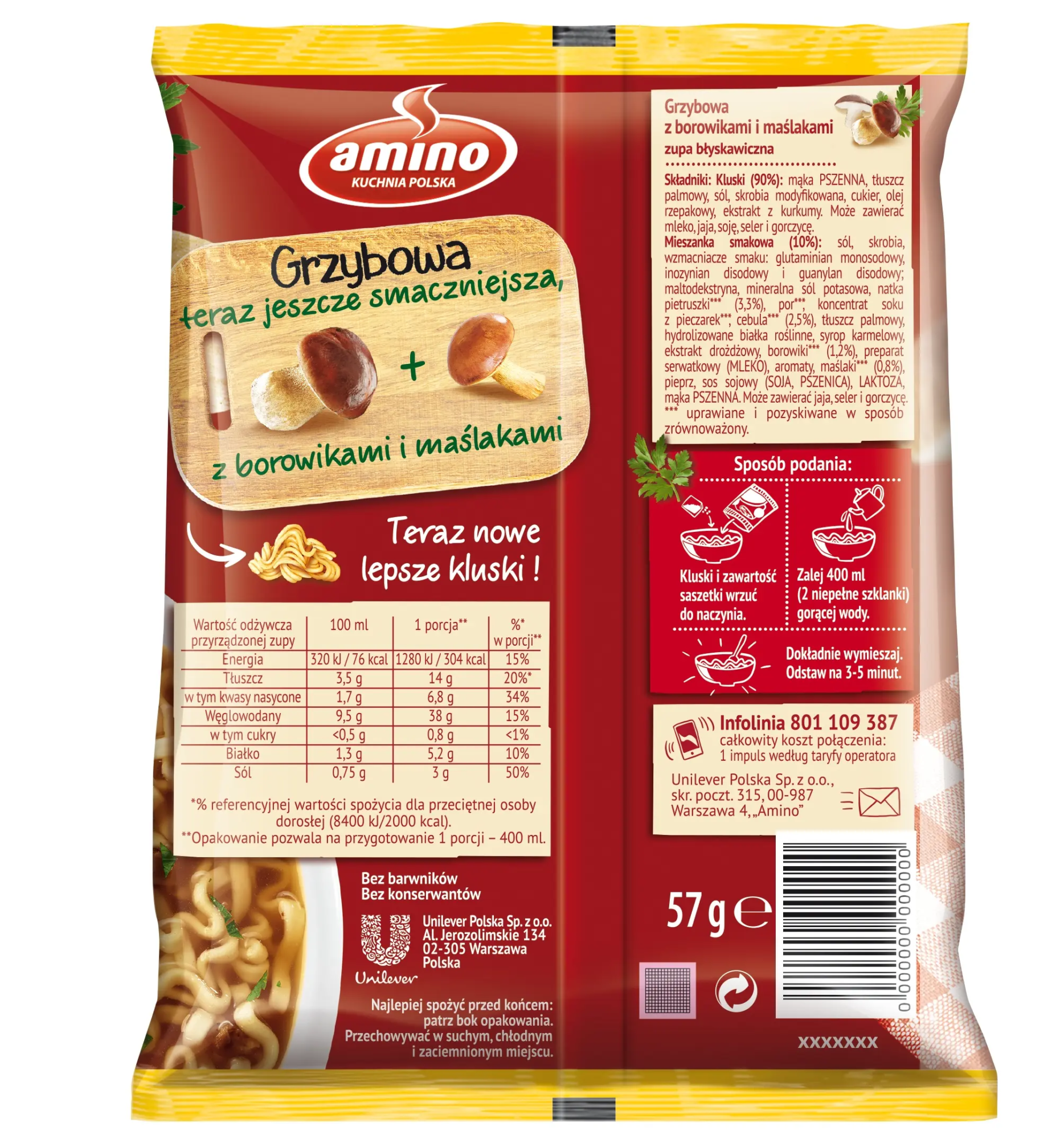 Skład: Kluski (91,2%): mąka pszenna, tłuszcz palmowy, skrobia modyfikowana, sól, cukier, olej rzepakowy, naturalny aromat kurkumy. Może zawierać seler, jaja, mleko, gorczycę, inne zboża zawierające gluten i soję. Mieszanka smakowa (8,8%): sól jodowana, skrobia, wzmacniacze smaku: glutaminian monosodowy, inozynian disodowy i guanylan disodowy; maltodekstryna, mineralna sól potasowa, natka pietruszki (3,3%), aromaty, koncentrat soku z pieczarek (2,7%), cebula (2,5%), hydrolizowane białko roślinne, syrop karmelowy, ekstrakt drożdżowy, tłuszcz palmowy, borowiki (1,2%), sos sojowy (soja, pszenica), preparat serwatkowy (z mleka), maślaki (0,8%), pieprz, laktoza, mąka pszenna, sól. Może zawierać seler, jaja, gorczycę i inne zboża zawierające gluten..