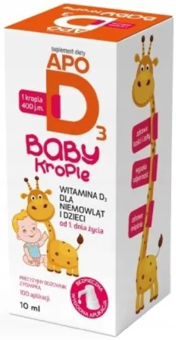 ApoD3 Baby to krople zawierające witaminę D3 przeznaczone dla noworodków, niemowląt i dzieci od 1. roku życia. Witamina D wspomaga prawidłowe funkcjonowanie układu odpornościowego i mięśni oraz utrzymanie zdrowych kości i zębów. Produkt dostarcza odpowiednią dawkę witaminy D w łatwej do podania formie kropli z pompką dozującą.