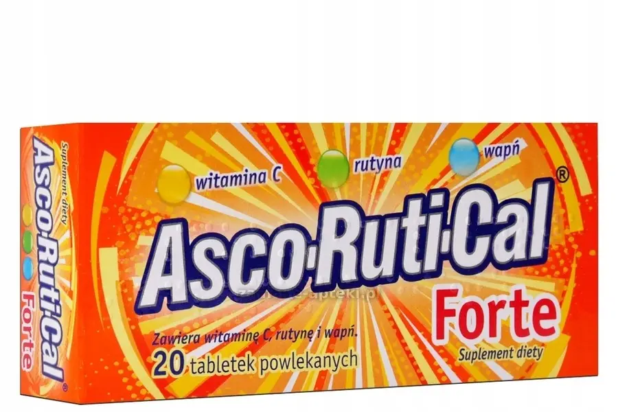 AscoRutiCal Forte, suplement diety w postaci tabletek powlekanych, zawierających zestaw trzech składników: witaminy C, rutyny oraz wapnia wspierających odporność organizmu, szczególnie w okresie jesienno-zimowym. Witamina C wspomaga prawidłowe funkcjonowanie układu nerwowego i odpornościowego oraz przyczynia się do zmniejszenia uczucia zmęczenia i znużenia. Wapń pomaga w prawidłowym funkcjonowaniu mięśni i w utrzymaniu prawidłowego przekaźnictwa nerwowego oraz wspiera utrzymanie zdrowych zębów i kości.