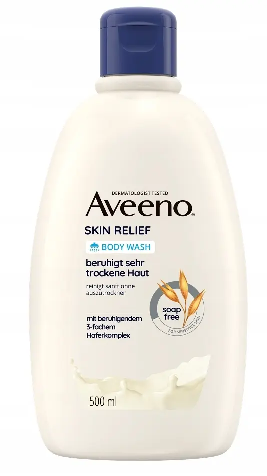Aveeno Skin Relief to nawilżający żel do mycia ciała, który delikatnie oczyszcza skórę, nie wysuszając jej. Pozostawia przyjemne uczucie ukojenia i odżywienia. Formuła z Kompleksem z Potrójnym Owsem łagodzi bardzo suchą skórę i pomaga utrzymać naturalną równowagę mikrobiomu skóry. Unikalna hipoalergiczna formuła, nie zawiera substancji zapachowych i mydła oraz jest odpowiednia dla bardzo suchej i wrażliwej skóry.