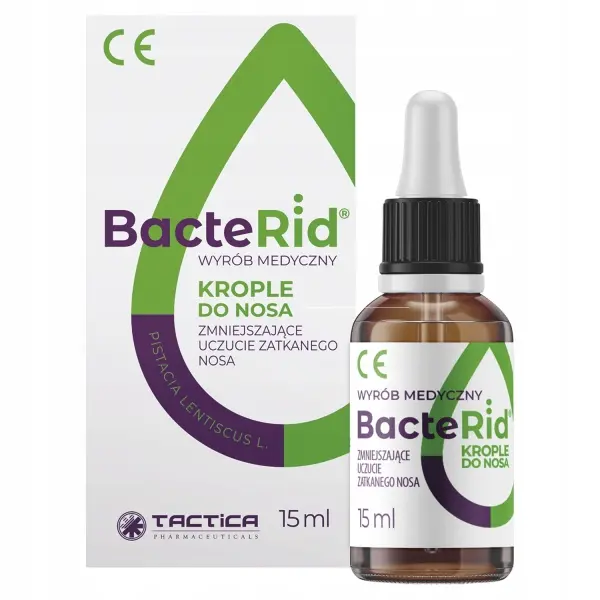 Bacterid to wyrób medyczny w postaci kropli do nosa stosowany w przypadku przekrwienia błony śluzowej nosa i ułatwiający upłynnianie wydzieliny z nosa w celu udrożnienia zatkanych przewodów nosowych i łatwiejszego oddychania; dzięki składnikom emolientowym, łagodzi błonę śluzową nosa podrażnioną stanem zapalnym wywołanym przeziębieniem. Sposób użycia Dzieci od 2 roku życia: 3 krople 3 razy dziennie do każdego otworu nosowego. Dorośli: 5 kropli 2 razy dziennie do każdego otworu nosowego. O ile lekarz nie zaleci inaczej. Składniki olej z owoców drzewa mastyksowego (Pistacia lentiscus L.), witamina E (DL-alfa-tokoferol), masło Shea (Butyrospermum Parkii), estry PEG-6 oleju z pestek moreli, trójglicerydy średniołańcuchowych kwasów tłuszczowych Ostrzeżenia: Należy przeczytać instrukcję używania dołączoną do opakowania. To jest wyrób medyczny. Używaj go zgodnie z instrukcją używania lub etykietą. Wyrób medyczny - posiada oznakowanie CE Posiada deklarację zgodności UE Zawiera instrukcję obsługi w języku polskim Zawiera etykietę w języku polskim Przechowywanie oraz transport wyrobów medycznych są zgodne z warunkami określonymi przez producenta. Podmiot odpowiedzialny: TACTICA Pharmaceuticals Sp. z o.o. ul. Królowej Jadwigi 148A/1A 30-212 Kraków