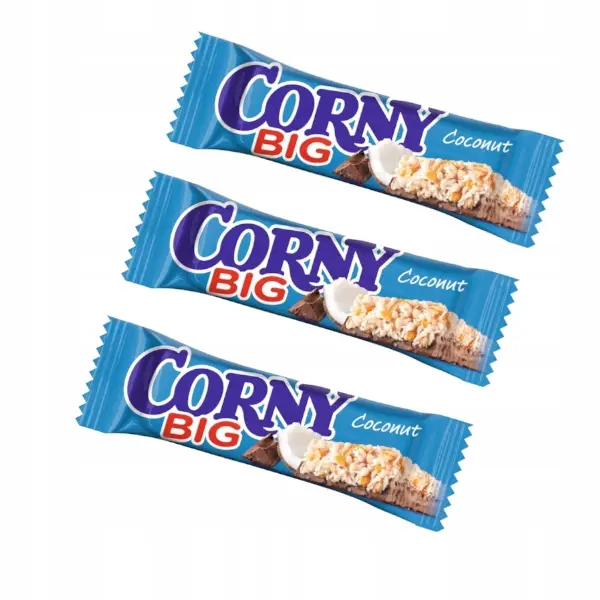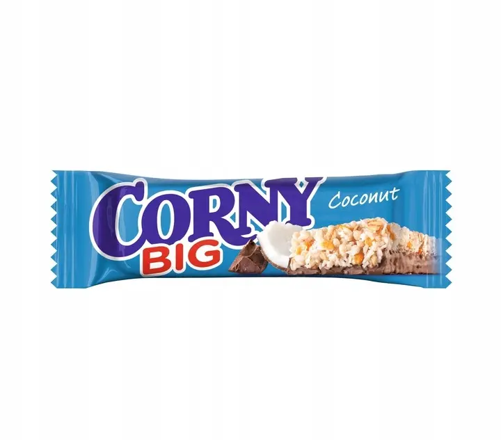 Baton Corny BIG to połączenie zbóż (owsianych, pszennych) oraz płatków kukurydzianych z mleczna czekoladą i płatkami kokosowymi.