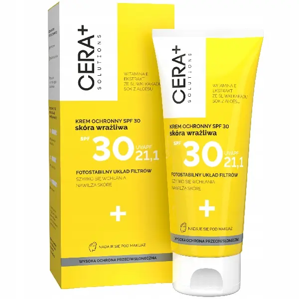CERA+ krem ochronny SPF30 dla skóry wrażliwej przeznaczony do ochrony wrażliwej skóry przed szkodliwym działaniem promieni słonecznych. Odpowiedni również do skóry naczynkowej. Zawiera fotostabilne filtry UVA i UVB zarówno chemiczne jak i mineralne, nowej generacji. Zawiera składniki antyoksydacyjne opóźniające proces fotostarzenia.