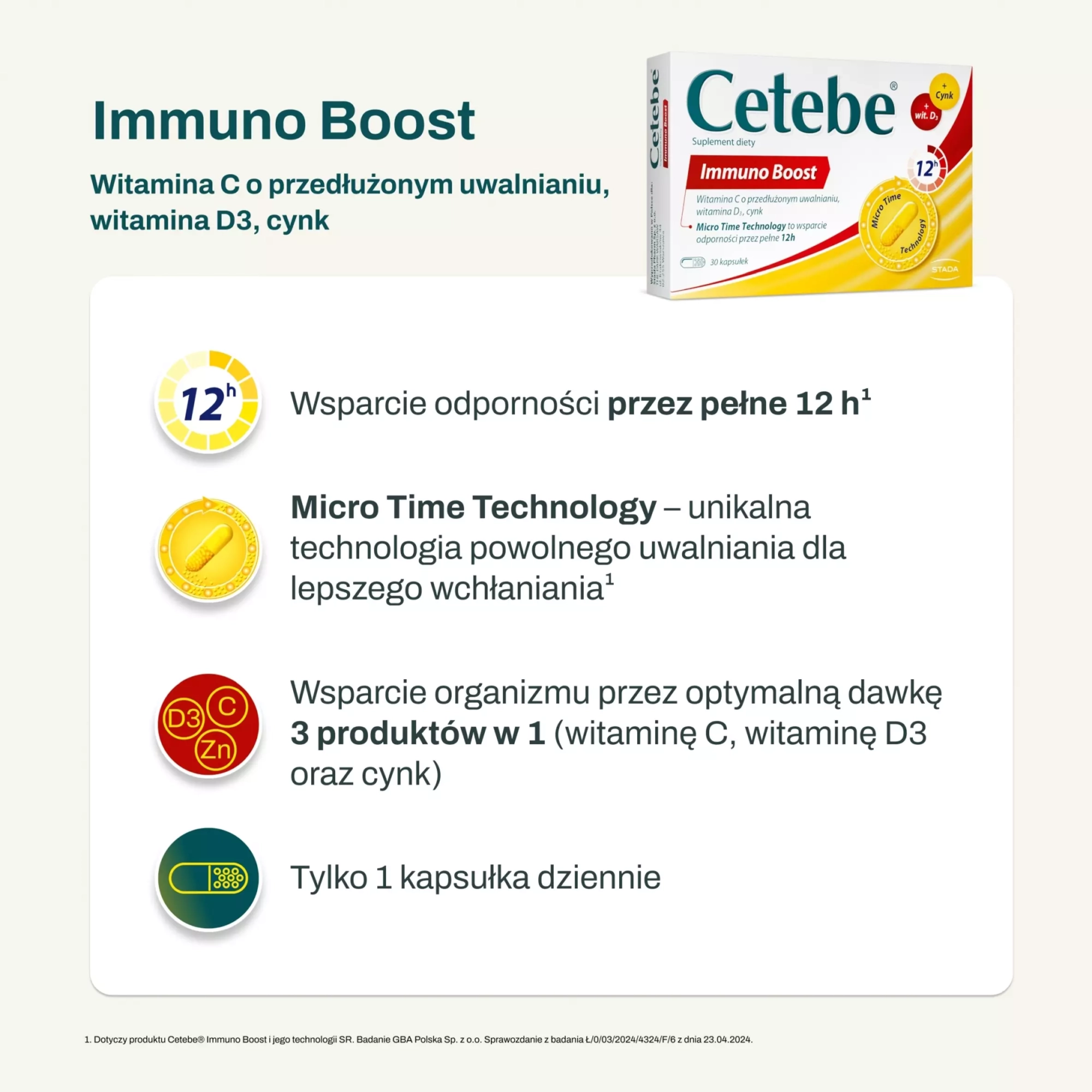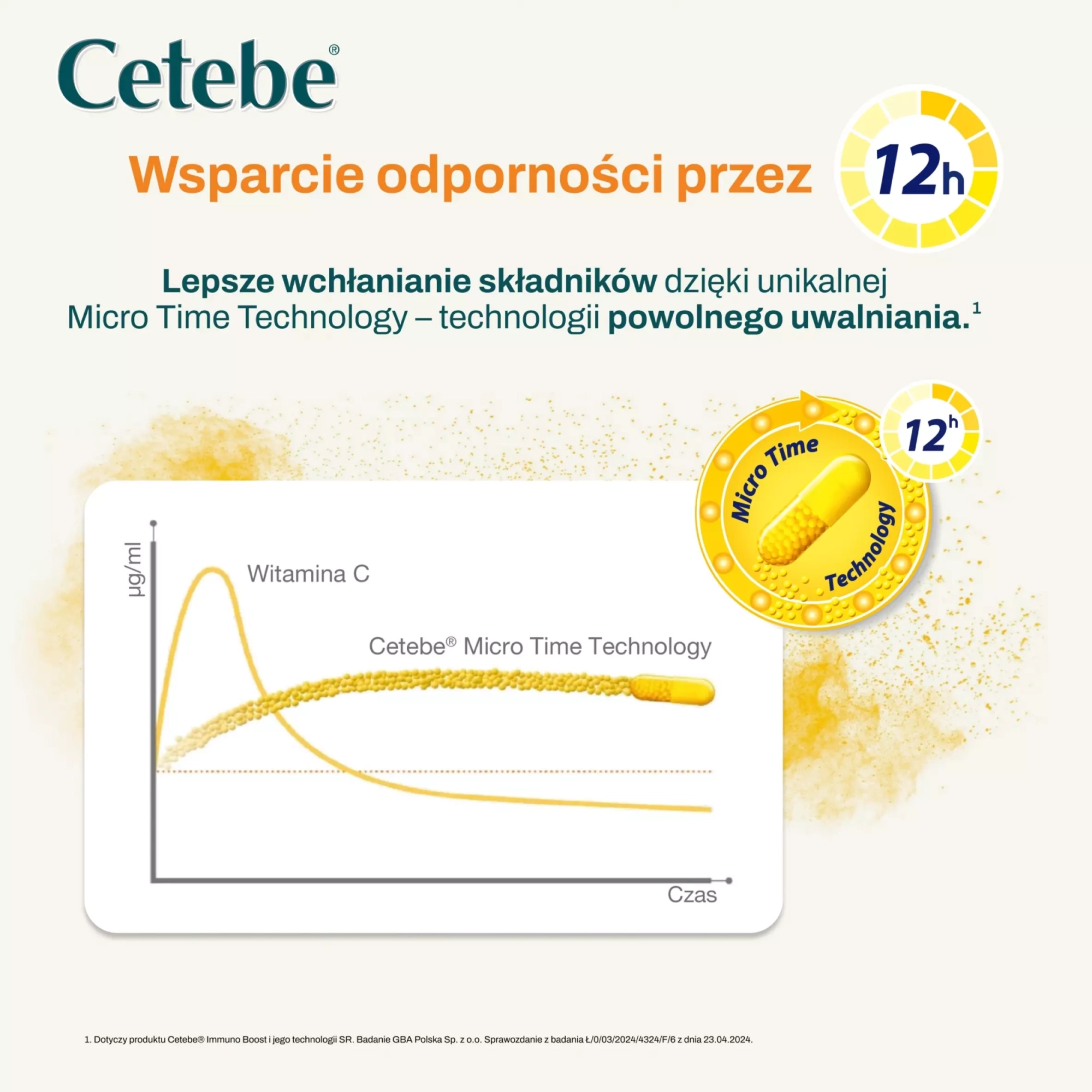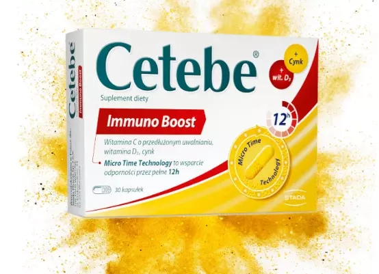 To, co wyróżnia Cetebe Immuno Boost, to zastosowanie zaawansowanej technologii Micro Time Technology. Tradycyjne preparaty z witaminą C są szybko wydalane z organizmu, natomiast specjalne granulki Cetebe uwalniają substancję czynną powoli, przez pełne 12 godzin. Dzięki temu organizm utrzymuje stabilny poziom witaminy C we krwi, co pozwala na jej niemal całkowite przyswojenie i wykorzystanie przez komórek.