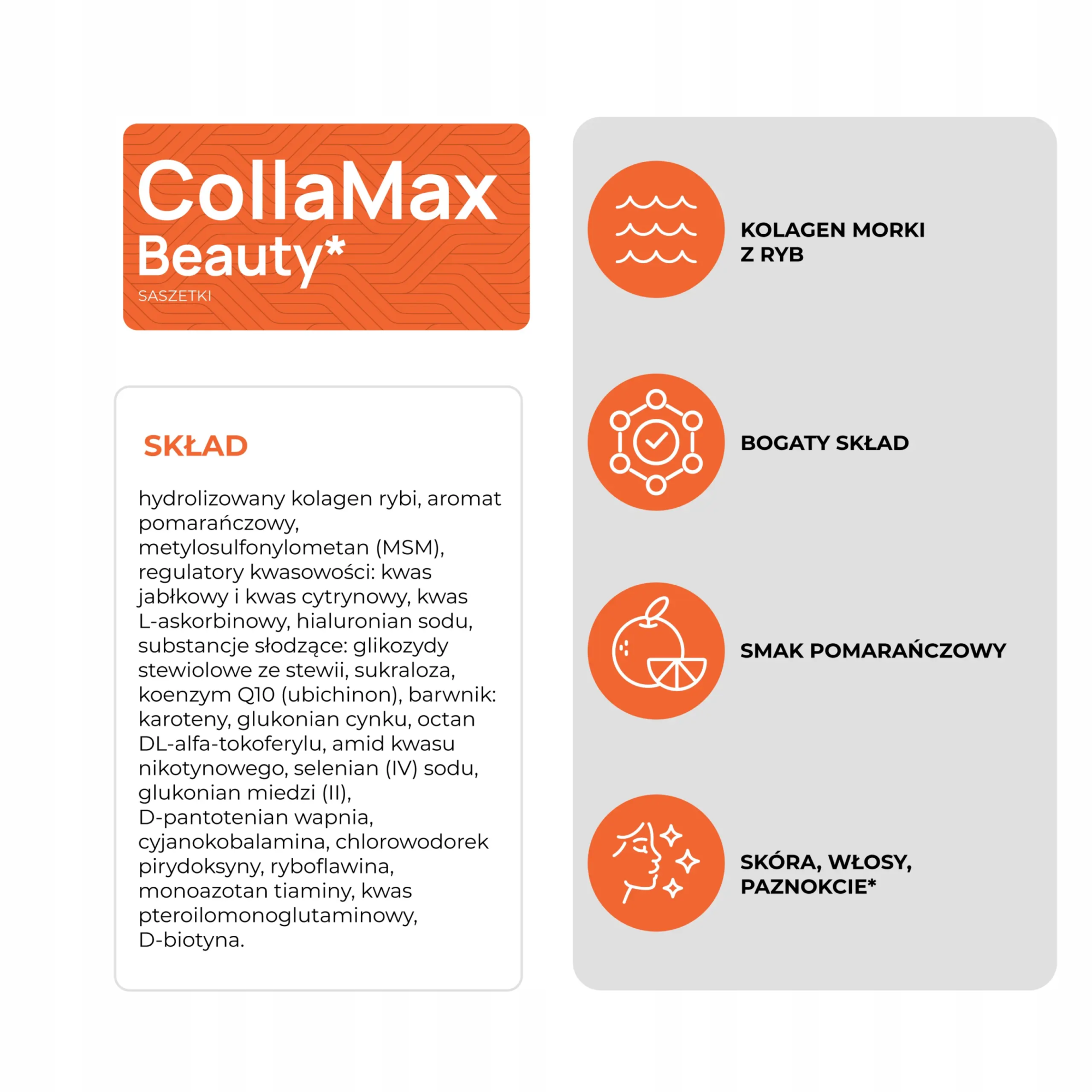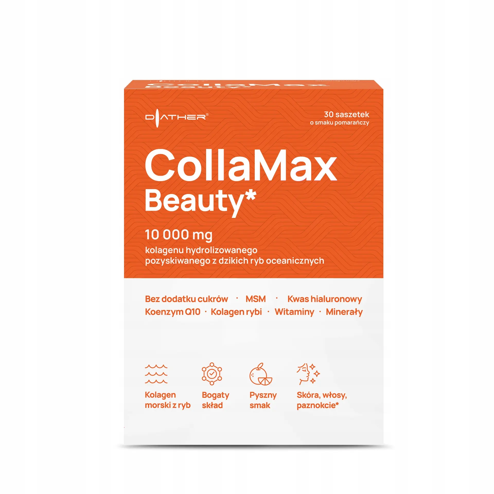 CollaMax Beauty* to suplement diety o smaku pomarańczy, zawierający 10 000 mg kolagenu hydrolizowanego pozyskiwanego z dzikich ryb oceanicznych.