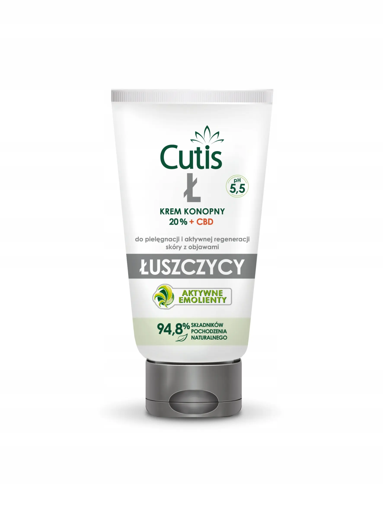 Cutis Ł łuszczyca, krem konopny 20% + CBD to emolient na bazie oleju konopnego, który przyczynia się do zmniejszenia stanów zapalnych skóry podczas łuszczycy. Obecne w składzie CBD działa przeciwzapalnie, przeciwbakteryjnie i silnie regenerująco. Kosmetyk przyczynia się do zmniejszenia zmian.