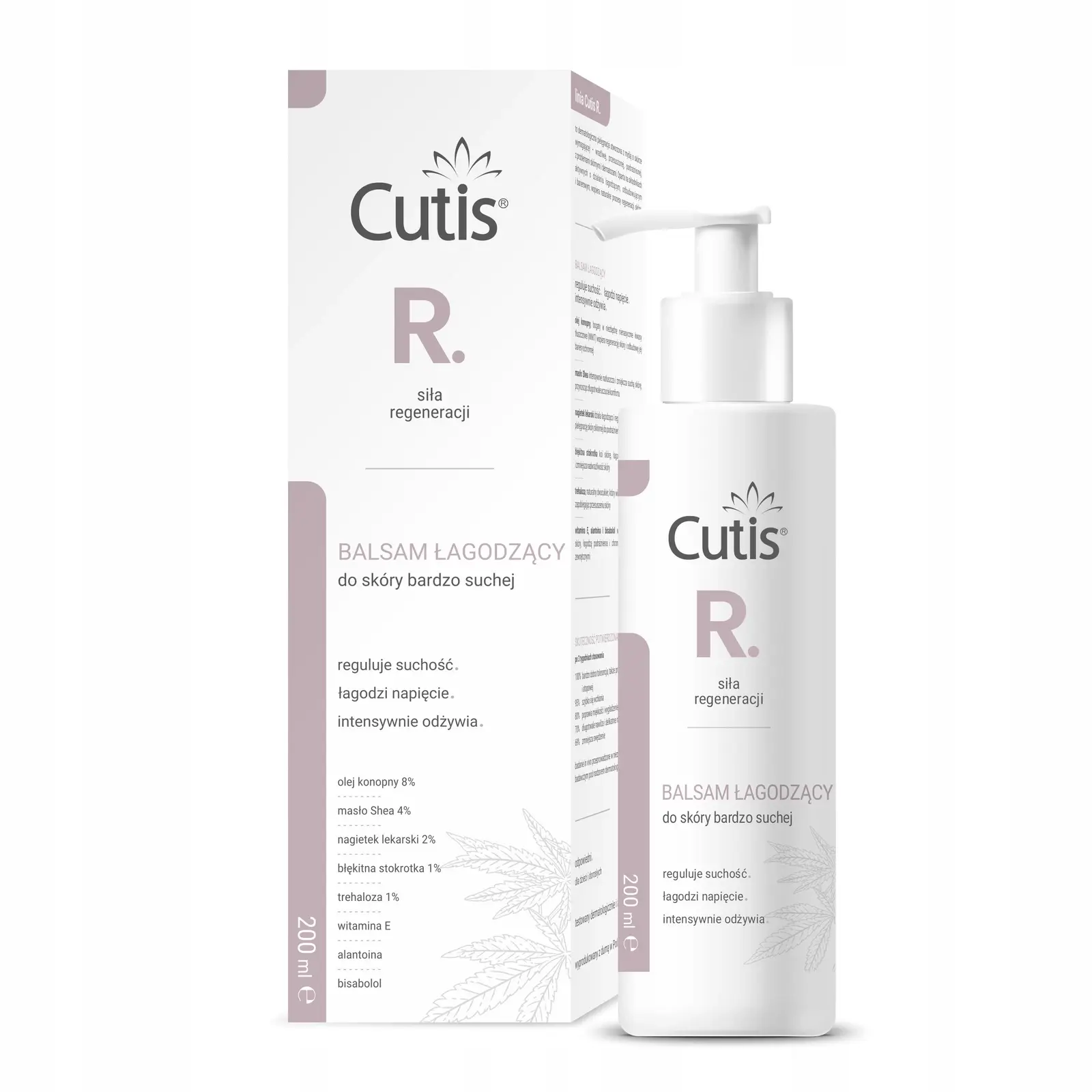 Cutis R–REGENERACJA balsam łagodzący do skóry bardzo suchej wskazany do codziennej pielęgnacji, także w przebiegu podrażnień, wrażliwości, atopii, alergii oraz innych problemów skórnych i dermatoz. Reguluje suchość, łagodzi napięcie, intensywnie odżywia i nawilża naskórek, poprawiając jego miękkość i elastyczność. Zmniejsza swędzenie i szybko się wchłania, nie pozostawiając tłustego filmu.