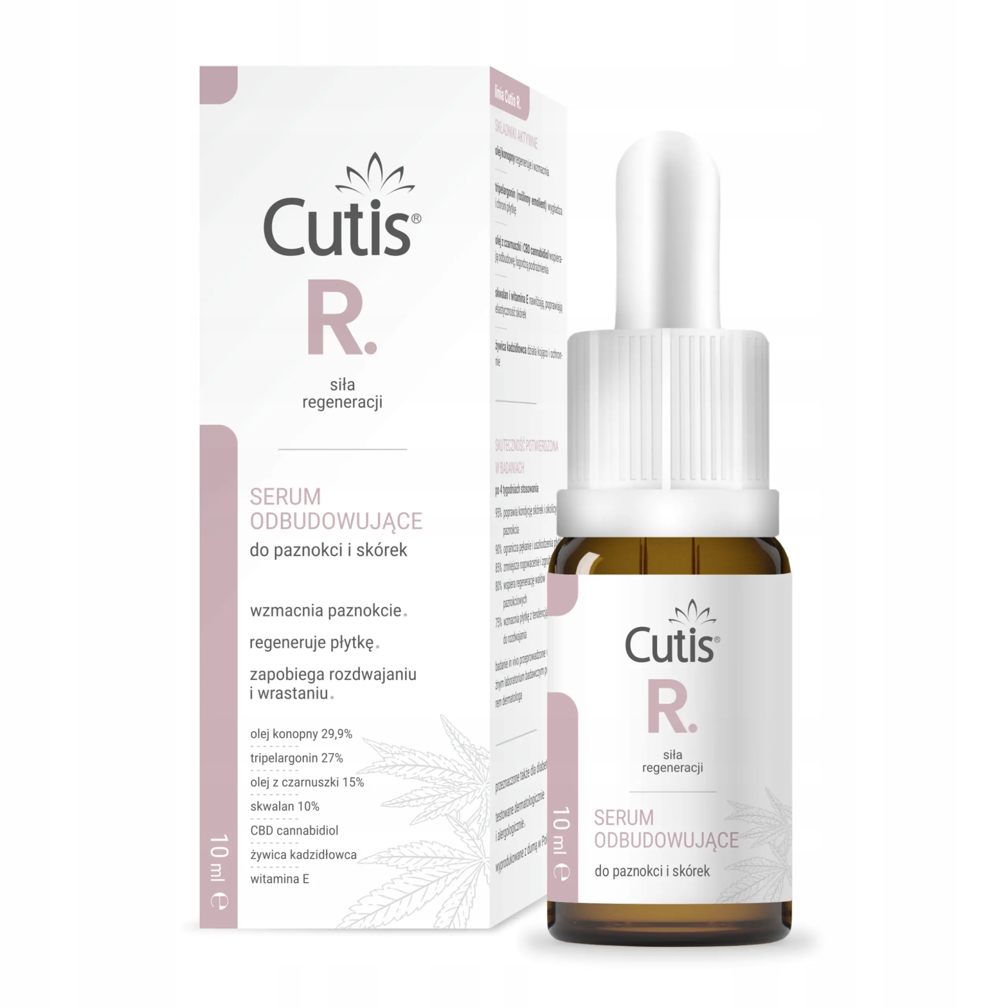 Cutis R-REGENERACJA serum odbudowujące do paznokci i skórek to preparat przeznaczony do paznokci osłabionych, łamliwych, rozdwajających się, skłonnych do pękania i rogowacenia, wymagających regeneracji – również po zabiegach stylizacji (hybryda, żel). Polecane do codziennej pielęgnacji skórek i okolic paznokci oraz jako wsparcie w profilaktyce wrastania. Unikalna formuła z olejem konopnym (29,9%), olejem z czarnuszki, CBD, skwalanem i żywicą kadzidłowca głęboko odżywia płytkę, wzmacnia ją i chroni przed pękaniem. Serum wygładza i regeneruje paznokcie, wspiera ich zdrowy wzrost, a przy tym intensywnie zmiękcza i nawilża skórki, zapobiegając wrastaniu. Jeśli paznokcie paznokcie potrzebują regeneracji po hybrydzie, żelu czy akrylu, Cutis R–REGENERACJA serum odbudowujące przywróci im siłę, elastyczność i zdrowy wygląd, jednocześnie dbając o delikatne skórki i okolice paznokci. Wysokie stężenie oleju konopnego (29,9%), oleju z czarnuszki, CBD i skwalanu intensywnie odżywia płytkę, wzmacnia ją i zabezpiecza przed łamaniem oraz rozdwajaniem. Naturalne składniki aktywne stymulują regenerację, a żywica kadzidłowca i witamina E łagodzą mikrouszkodzenia i wspierają gojenie, również po opracowaniu skórek. Serum rekomendowane jest także dla diabetyków – jego delikatna, wnikająca formuła zmiękcza i chroni skórki, wspiera odbudowę wałów paznokciowych i zmniejsza ryzyko pęknięć oraz podrażnień, które u osób z cukrzycą mogą być szczególnie problematyczne. Efekt? Mocne, gładkie i zdrowe paznokcie.