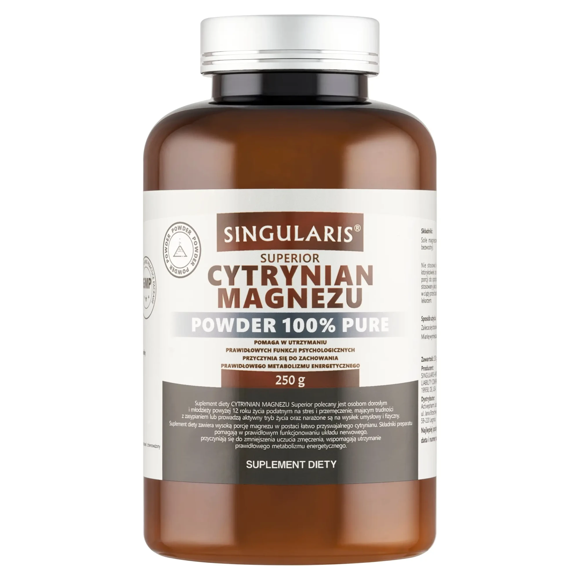 SINGULARIS Cytrynian magnezu Powder polecany jest osobom dorosłym i młodzieży powyżej 12 roku życia podatnym na stres i przemęczenie, mającym trudności z zasypianiem lub prowadzą aktywny tryb życia oraz narażone są na wysiłek umysłowy i fizyczny. Cytrynian magnezu pomaga w prawidłowym funkcjonowaniu układu nerwowego, wspomaga prawidłowe funkcjonowanie mięśni, przyczynia się do zmniejszenia uczucia zmęczenia i znużenia, stanowi integralną część struktury błon komórkowych, wewnątrzkomórkowych i mitochondrialnych, wspomaga w utrzymaniu prawidłowych funkcji psychologicznych.