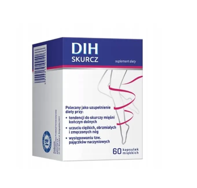 Suplement diety DIH Skurcz to suplement diety w postaci kapsułek, przeznaczony dla osób z tendencją do mimowolnych skurczy mięśni kończyn dolnych, uczucia ciężkości nóg oraz pojawiających się „pajączków naczyniowych”. Produkt zawiera diosminę, magnez, trokserutynę i witaminę C – składniki, które wspomagają prawidłowe krążenie żylne i zdrowie naczyń krwionośnych.