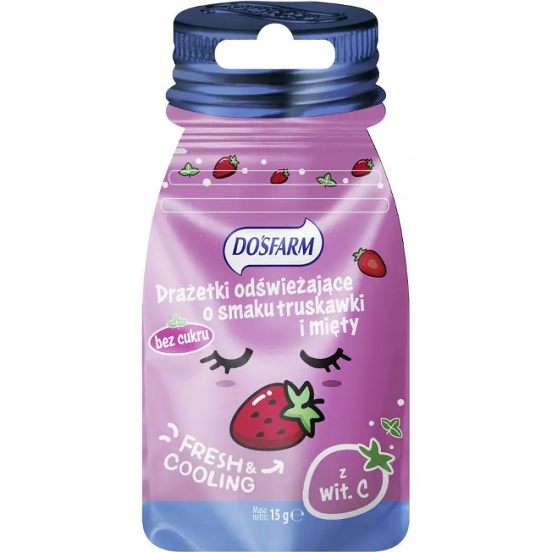 Dosfarm Drażetki odświeżające o smaku truskawki i mięty 15 g to szybko rozpuszczalne pastylki zaprojektowane do doraźnego odświeżenia oddechu, łączące owocową nutę truskawki z chłodną miętą; produkt nie zawiera dodanego cukru, do słodzenia użyto sorbitolu, a drażetki są pakowane w poręczne opakowanie w kształcie buteleczki z zamknięciem strunowym dla zachowania świeżości.