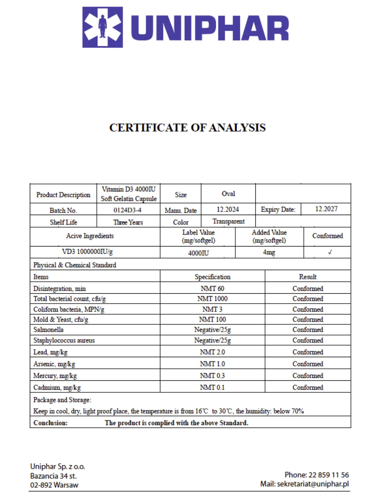 Każdy suplement Duratio przechodzi szczegółowe badania pod kątem bezpieczeństwa mikrobiologicznego oraz zawartości metali ciężkich, aby zapewnić najwyższą jakość i pewność stosowania. Witamina D3 Duratio 4000 IU jest: ✔️ wolna od metali ciężkich, ✔️ wolna od drobnoustrojów i zanieczyszczeń, ✔️ zatwierdzona na podstawie niezależnych badań laboratoryjnych. Przedstawiamy pełną dokumentację potwierdzającą czystość i bezpieczeństwo produktu – bo Twoje zdrowie jest dla nas priorytetem.