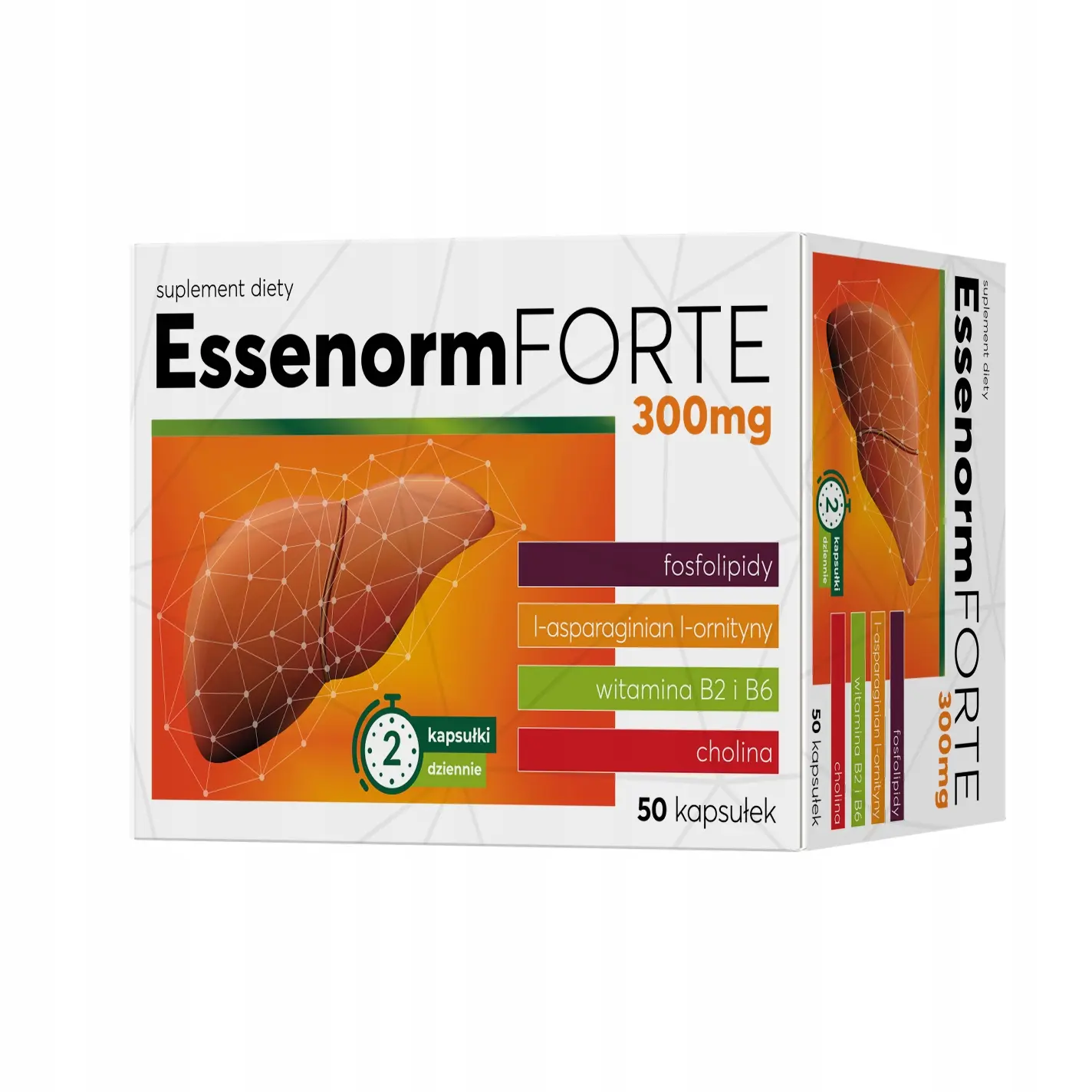 Essenorm Forte 300 mg to suplement diety, który w swoim składzie zawiera: fosfolipidy, l-asparaginian l-ornityny, witaminę B2 i b6 oraz cholinę. Preparat przeznaczony jest dla osób powyżej 16. roku życia oraz dorosłych.