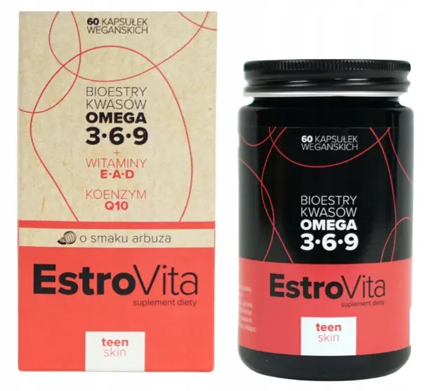 EstroVita Teen Skin to suplement diety stanowiący unikalną kompozycję roślinnych kwasów tłuszczowych omega-3,6,9 wyizolowanych z unikalnej mieszaniny aż 4 olejów roślinnych (lnianego, z wiesiołka, awokado oraz pestek arbuza). Olejek z rozmarynu – wspiera układ odpornościowy oraz naturalną obronę organizmu. Produkt przeznaczony jest dla osób dbających o wygląd i kondycję skóry. Roślinne niezbędne nienasycone kwasy tłuszczowe (NNKT) z grupy omega, koenzym Q10 oraz witaminy zawarte w produkcie sprzyjają atrakcyjnemu wyglądowi skóry. EstroVita Teen Skin zawiera ultraczystą formę kwasów tłuszczowych z grupy omega w postaci estrów etylowych, które zapewniają znakomitą biodostępność i wysoką ich bioretencję w organizmie.