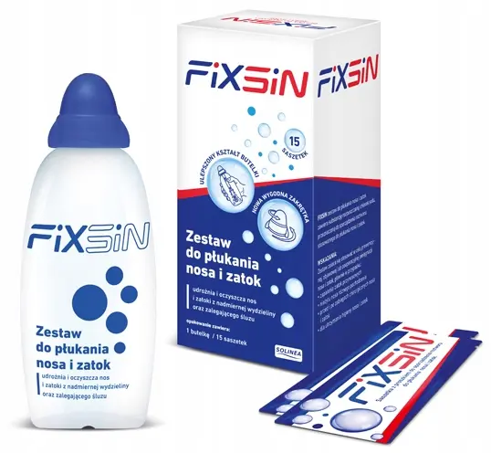 Fixsin zestaw do płukania nosa i zatok zawiera butelkę o pojemności 240 ml oraz 15 saszetek z proszkiem do sporządzania roztworu. Produkt udrażnia i oczyszcza nos i zatoki z nadmiernej wydzieliny oraz zalegającego śluzu, przez co ogranicza gromadzenie się czynników mających wpływ na powstawanie infekcji. Rozpuszczalną substancją czynną wyrobu medycznego Fixsin jest chlorek sodu. Zestaw do płukania nosa i zatok Fixsin można stosować w warunkach domowych zarówno u dorosłych, jak i u dzieci powyżej 4 roku życia. Irygacja przy wykorzystaniu zestawu Fixin służy do prewencyjnej lub objawowej pielęgnacji nosa lub zatok przy nieżycie nosa, lub stanach zapalnych zatok, a także utrzymaniu higieny nosa i zatok w celu eliminacji alergenów oraz innych zanieczyszczeń, które gromadzą się w jamie nosowej.