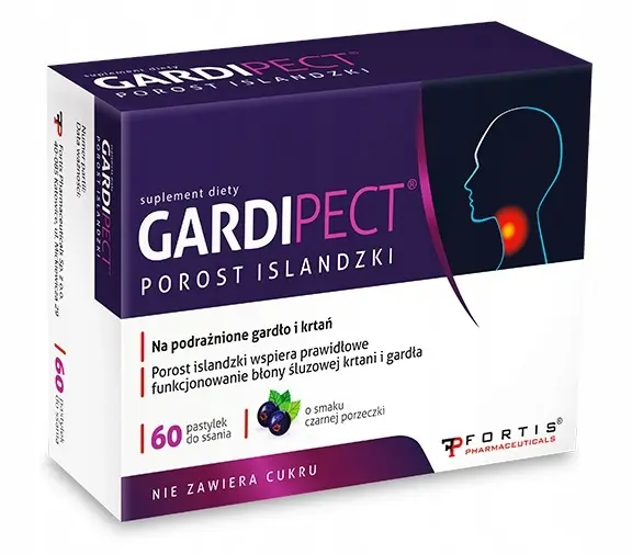 Suplement diety Gardipect porost islandzki w postaci miękkich pastylek do ssania zawiera naturalne wyciągi ziołowe z porostu islandzkiego, pelargonii afrykańskiej, dziewanny drobnokwiatowej oraz witaminę C. Ekstrakt z porostu islandzkiego przynosi ulgę w przypadku podrażnionej błony śluzowej jamy ustnej, krtani, gardła oraz strun głosowych. Witamina C wspomaga prawidłowe funkcjonowanie układu odpornościowego.