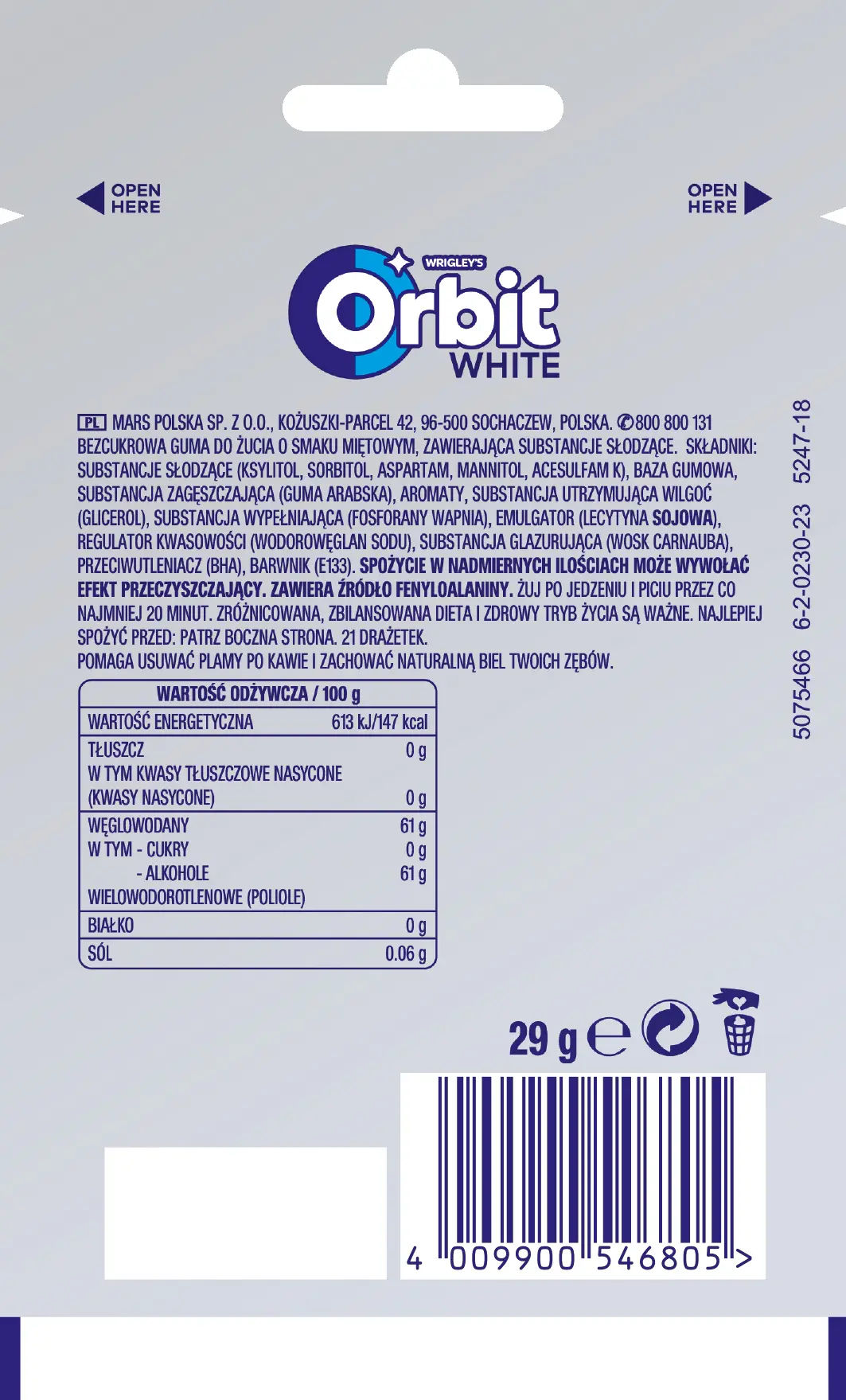 Składniki: substancje słodzące (ksylitol, sorbitol, aspartam, mannitol, acesulfam K), baza gumowa, substancja zagęszczająca (guma arabska), aromaty, substancja utrzymująca wilgoć (glicerol), substancja wypełniająca (fosforany wapnia), emulgator (lecytyna sojowa), regulator kwasowości (wodorowęglan sodu), substancja glazurująca (wosk carnauba), przeciwutleniacz (BHA), barwnik (E133)