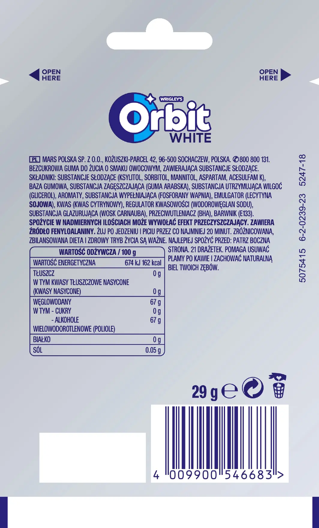 Bezcukrowa guma do żucia o smaku owocowym, zawierająca substancje słodzące. Składniki: substancje słodzące (ksylitol, sorbitol, mannitol, aspartam, acesulfam K), baza gumowa, substancja zagęszczająca (guma arabska), substancja utrzymująca wilgoć (glicerol), aromaty, substancja wypełniająca (fosforany wapnia), emulgator (lecytyna sojowa), kwas (kwas cytrynowy), regulator kwasowości (wodorowęglan sodu), substancja glazurująca (wosk carnauba), przeciwutleniacz (BHA), barwnik (E133). Spożycie w nadmiernych ilościach może wywołać efekt przeczyszczający. Zawiera źródło fenyloalaniny.