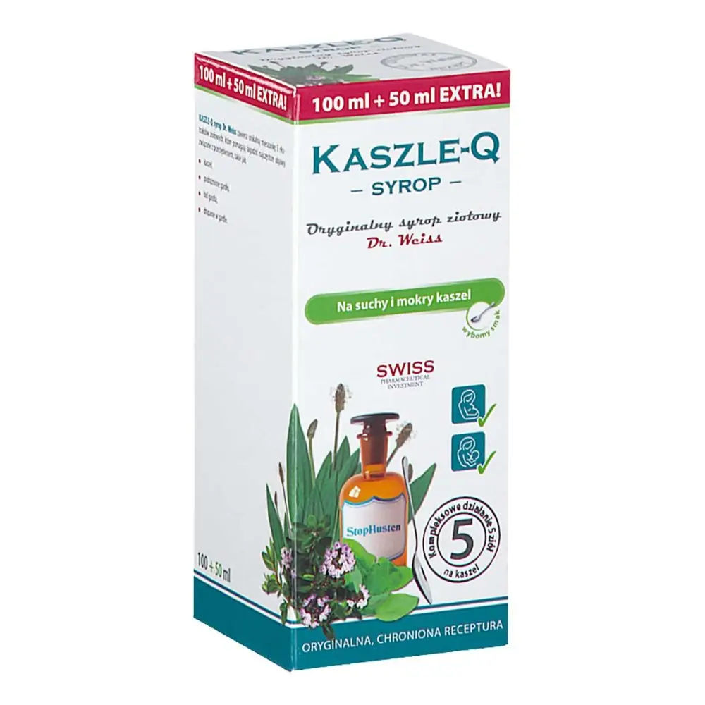 Syrop tworzy tymczasową warstwę ochronną na błonie śluzowej jamy ustnej i gardła, która wspomaga naturalne procesy regeneracyjne i przeciwzapalne oraz przyczynia się do utrzymania nawilżenia i elastyczności błony śluzowej, co łagodzi nieprzyjemne uczucie drapania i bólu gardła, a tym samym łagodzi podrażnienia przy kaszlu. Produkt dodatkowo wspomaga system odpornościowy i przyspiesza regenerację. KASZLE-Q syrop dla dzieci OD 1. ROKU został opracowany specjalnie na potrzeby dziecięcego organizmu i może być stosowany przez alergików, osoby z celiakią i diabetyków (słodzony fruktozą i sukralozą), mogą go stosować kobiety w ciąży i karmiące piersią (zawiera szereg łagodnych i bezpiecznych ziół).