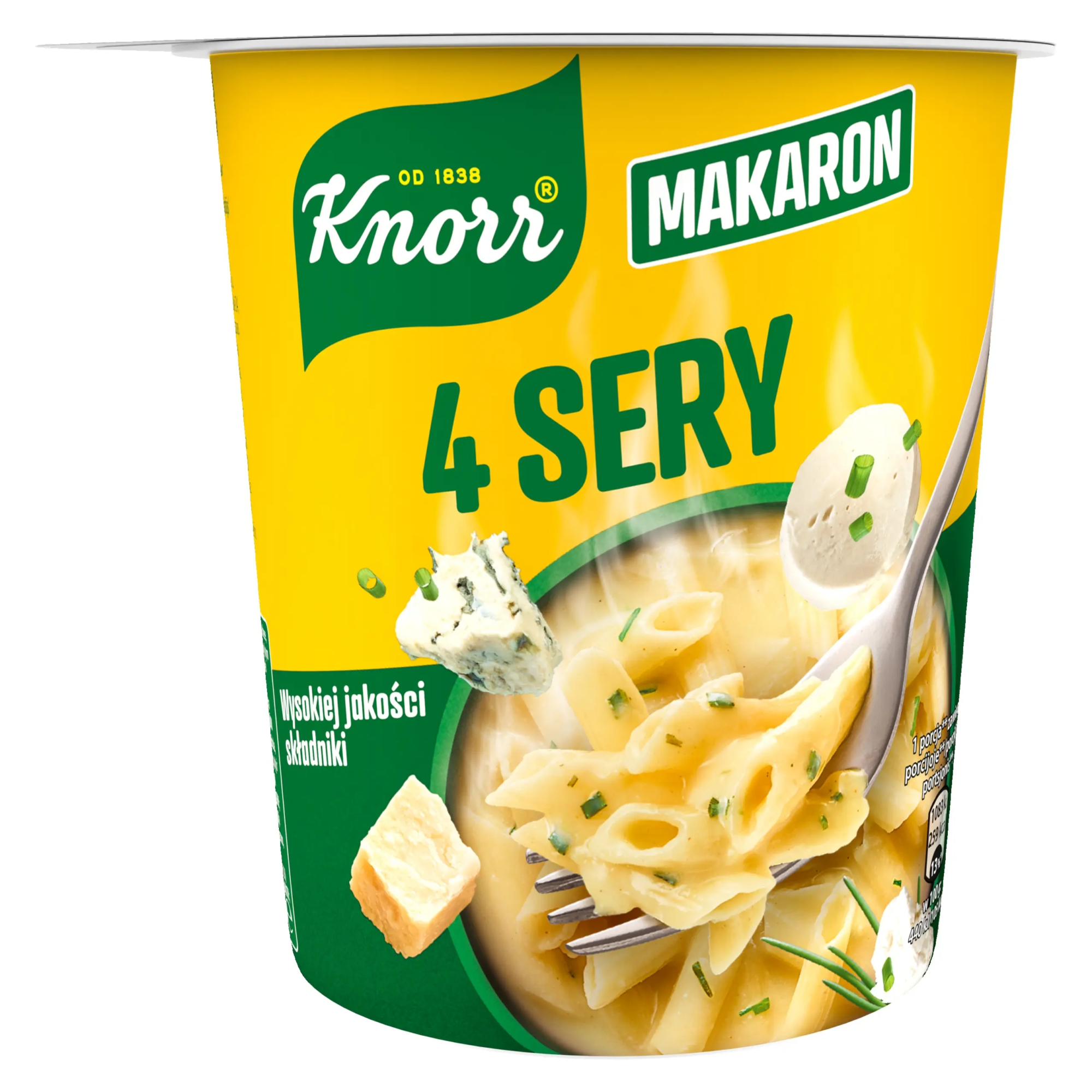 Knorr 4 Sery w kubku to pyszne, sycące danie instant, które zachwyca wyjątkowym aromatem czterech serów: cheddar, gouda, ementaler i blue. Dzięki kremowemu sosowi i delikatnemu makaronowi, każda porcja to prawdziwa uczta dla miłośników serowych smaków. Wystarczy zalać wrzątkiem, odczekać kilka minut i gotowe – pyszny, ciepły posiłek w kilka chwil!