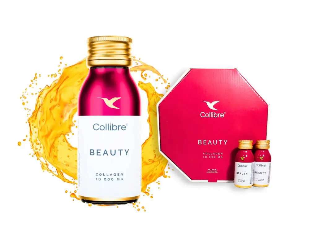 Odkryj suplement, który jest Twoim sprzymierzeńcem w dążeniu do naturalnego piękna: ❤️ wypróbuj nasz shot i wspomagaj spłycenie zmarszczek oraz odmłodzenie skóry, ❤️ suplement wspomaga osiągnięcie efektu jędrniejszej i bardziej elastycznej skóry, ❤️ składniki mogą wspomóc włosy - zyskają nowy blask i siłę, ❤️ składniki wspomagają wzmacnianie paznokci, dzięki czemu mogą stać się mniej łamliwe, ❤️ wspomaga zapobieganie powstawania cellulitu i rozstępów. Na tej aukcji oferujemy zestaw 15 buteleczek po 60 ml każda, co zapewnia suplementację na 15 dni. Zainwestuj w suplementację, aby rozpocząć drogę w kierunku pierwszych efektów. Odkryj sekret wsparcia Twojego młodzieńczego wyglądu z naszym kolagenem. Dołącz do grona osób, które: cenią naturalne piękno, chciałyby opóźnić oznaki starzenia, prowadzą aktywny styl życia, potrzebują dodatkowej suplementacji. Wybierz nasz kolagen i zacznij dbać o siebie na nowym poziomie! Dlaczego klienci wybierają nasz kolagen? ➡️ Nasz hydrolizat kolagenu wołowego, ze stopniem hydrolizy 2000 Da wspomoże uzupełnianie kolagenu w Twoim organizmie. Wybierając nasz produkt, korzystasz z zaawansowanej formuły. ➡️ Z naszą dzienną porcją otrzymasz aż 10 000 mg kolagenu, co często jest znacznie więcej niż w przypadku innych produktów tego typu. ➡️ Ciesz się wyjątkowym, owocowym smakiem. ➡️ Nasza butelka zapewnia komfort użytkowania w każdych warunkach. Dołącz do osób, które cenią sobie praktyczność i zawsze mają nasz produkt pod ręką. ➡️ Nasz produkt jest wolny od glutenu, laktozy, zbędnego dodatku cukru, białka mleka, konserwantów i sztucznych dodatków. ➡️ Dołącz do grona świadomych konsumentów, którzy wybierają polskie produkty wysokiej jakości. Wybierz nasz kolagen i dołącz do grona zadowolonych klientów, którzy wybierają to, co najlepsze! Kolagen Collibre Beauty to moc składników, które wspomagają Twoje samopoczucie i urodę: ✅ Witamina A: Kluczowy element w produkcji kolagenu, który odgrywa ważną rolę w utrzymaniu kondycji Twoich kości, zębów i naczyń krwionośnych. ✅ Witamina C: Niezbędna w produkcji kolagenu, wspomaga kondycję kości i stawów. Jej antyoksydacyjne właściwości pomagają chronić Twoje ciało przed szkodliwymi czynnikami zewnętrznymi. ✅ Witamina E: Znana ze swoich właściwości opóźniających starzenie, wspomaga dobrą kondycję skóry i wspiera kondycję wzroku. Dołącz do tych, którzy cenią sobie jej wpływ na wydolność mięśni. ✅ Kwas Hialuronowy: Wspomaga zachowanie elastyczności i jędrności skóry. Wypróbuj i poczuj różnicę, jaką może przynieść odpowiednie nawilżenie i odżywienie skóry. ✅ Cynk: Wspiera układ odpornościowy oraz jest kluczowy dla rozwoju kości i układu nerwowego. ✅ Biotyna (Witamina B7): Znacząco poprawia kondycję włosów, wspierając ich wzrost, grubość i elastyczność. Dodatkowo, wzmacnia paznokcie, redukując ich łamliwość i pęknięcia. ✅ Ekstrakt z owoców opuncji figowej: Silny antyoksydant, chroniący Twoją skórę przed wolnymi rodnikami. Doświadcz ochrony, którą oferuje ten naturalny składnik, wzmacniając naturalną barierę ochronną skóry. Wybierając nasz kolagen, dołączysz do grona użytkowników, którzy cenią sobie kompleksowe działanie i wysoką jakość składników. SKŁAD Sok jabłkowy z zagęszczonego soku jabłkowego, hydrolizat kolagenu, ekstrakt z owoców opuncji figowej (Opuntia ficus indica L. Mill), regulator kwasowości (kwas cytrynowy), aromat, witamina C (kwas L-askorbinowy), kwas hialuronowy, cynk (glukonian cynku), ekstrakt z pędów bambusa (Bambusa vulgaris Schrad,) – źródło krzemu, witamina E (octan DL-alfa-tokoferylu), witamina A (octan retinylu), witamina B7 (D-biotyna). Składniki w jednej porcji 60ml: Hydrolizat kolagenu wołowego - 10g Witamina C (kwas L-askorbinowy) - 80mg (100%*) Kwas hialuronowy - 100mg Cynk (glukonian cynku) - 10mg (74,4mg) (100%*) Witamina E (octan DL-alfa-tokoferylu) - 12mg (100%*) Witamina A (octan retinylu) - 800µg (100%*) Witamina B7 (D-biotyna) - 50µg (100%*) Krzem (ekstrakt z pędów bambusa) - 12mg (18mg) Ekstrakt z owoców opuncji figowej - 1g *RWS: dzienna referencyjna wartość spożycia. Wartość odżywcza w 100 ml - w porcji 60 ml Energia, 319 kJ/76 kcal - 191 kJ/46 kcal Tłuszcz, 0g - 0g – w tym kwasy tłuszczowe nasycone, 0g - 0g Węglowodany, 13g - 7,8g – w tym cukry, 11g - 6,6g Błonnik, 1g - 0,6g Białko, 17g - 10g Sól, 0,11g - 0,07g Jak spożywać? ZALECANE DZIENNE SPOŻYCIE: 1 buteleczka (60 ml). Nie przekraczać zalecanej porcji do spożycia w ciągu dnia. SPOSÓB UŻYCIA: przed użyciem wstrząsnąć. Zaleca się regularne stosowanie przez dłuższy czas (minimum 4 tygodnie). Najlepiej pić schłodzony, do 24 godzin po otwarciu. Tworzenie się osadów jest zjawiskiem naturalnym i nie świadczy o wadzie produktu. Ze względu na obecność składników naturalnych barwa produktu może ulegać zmianie (od złotej do ciemnobrązowej). OSTRZEŻENIA: nie stosować w przypadku nadwrażliwości na którykolwiek ze składników produktu. Kobiety w ciąży i karmiące piersią przed zastosowaniem powinny skonsultować się z lekarzem. Produkt przeznaczony wyłącznie dla osób dorosłych. Suplement diety nie może być stosowany jako substytut (zamiennik) zróżnicowanej diety. Prowadzenie zdrowego trybu życia i stosowanie zrównoważonej diety są niezbędne dla zachowania prawidłowego stanu zdrowia. Suplement diety przeznaczony dla zdrowej populacji osób dorosłych do 75. roku życia. Nie stosować u osób mających predyspozycje do tworzenia kamieni nerkowych lub chorujących na kamicę nerkową. PRZECHOWYWANIE: przechowywać w suchym, ciemnym miejscu, w temperaturze poniżej 25°C. Suplementy diety powinny być przechowywane w sposób niedostępny dla małych dzieci. Producent: Collibre Sp. z o.o.ul. Pszczela 16, 11-034 Tomas