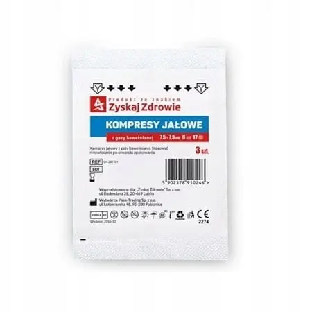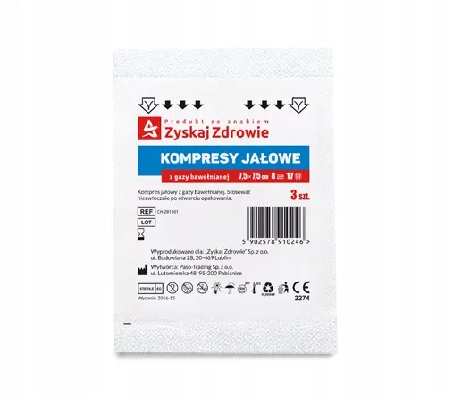 Jałowe kompresy z gazy bawełnianej o wymiarach 10 x 10 cm. Białe, miękkie, nieco grubsze, 8-warstwowe. Bardzo chłonne i przepuszczalne dla powietrza. Pakowane po 3 sztuki.