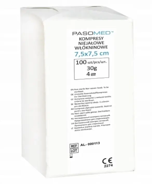 Pasomed Kompres Włókninowy Niejałowy 30g/m2 4W – 7,5 x 7,5 cm – 100 sztuk