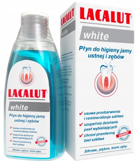 LACALUT WHITE płyn do higieny jamy ustnej i zębów stanowiący uzupełnienie codziennej pielęgnacji. Polecany również do płukania jamy ustnej przez osoby używające protezy, aparaty ortodontyczne. Zawiera fluorek sodu – 135 ppm fluorku.