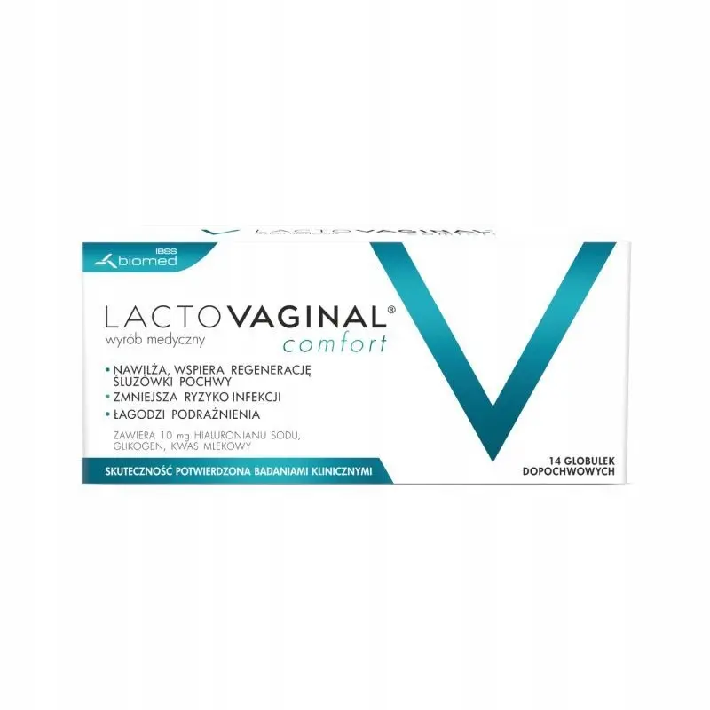 LACTOVAGINAL comfort to wyrób medyczny w postaci globulek dopochwowych zawierający 10 mg hialuronianu sodu, glikogen, kwas mlekowy. Globulki dopochwowe LACTOVAGINAL comfort nawilżają śluzówkę ścian pochwy, wspomagają procesy regeneracyjne, pomagają utrzymać fizjologiczne pH, a także chronią pochwę przed wpływem szkodliwych czynników zewnętrznych.