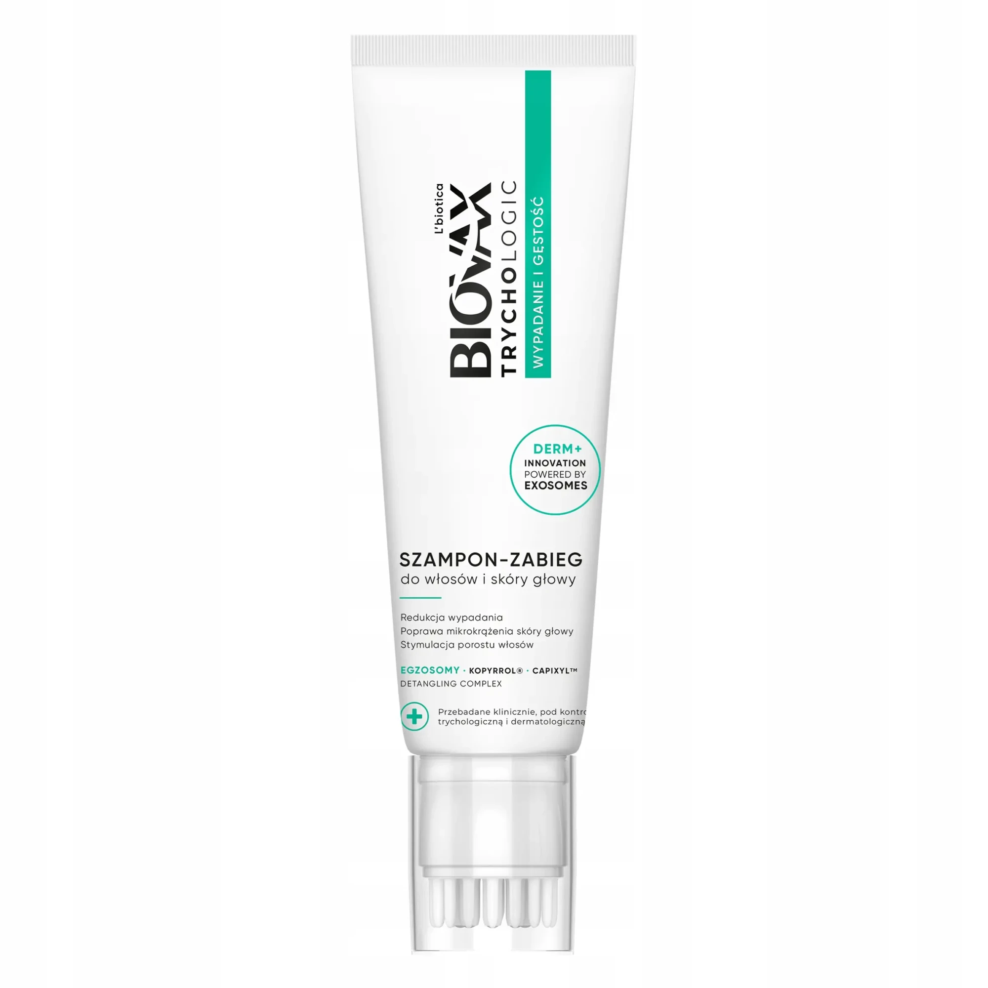 Biovax Trychologic to linia stworzona w oparciu o prawidłową logikę w podejściu do pielęgnacji włosów, której podstawą jest zdrowa skóra głowy. Trychologiczny szampon-zabieg przeciw wypadaniu włosów - końcówka do masażu głowy pobudza mikrokrążenie i głęboko oczyszcza skórę głowy, przez co wspomaga wnikanie składników aktywnych. Zastosowana technologia egzosomów zwiększa skuteczność działania, a także pielęgnuje skórę głowy. Kopyrrol wspiera aktywny wzrost włosa, przedłuża fazę anagenu i poprawia zakotwiczenie cebulek, a Capixyl zatrzymuje proces wypadania włosów. Dzięki DETANGLING COMPLEX szampon zapewnia także przyjemną gładkość włosów i ułatwia ich rozczesywanie.