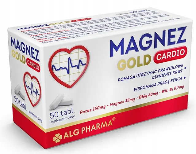MAGNEZ GOLD CARDIO to suplement diety, który zawiera 150 mg potasu, 35 mg magnezu w postaci cytrynianu magnezu oraz 60 mg głogu w jednej tabletce.