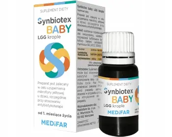 Synbiotex baby to probiotyk zawierającym szczep probiotyczny Lactobacillus rhamnosus GG – szczep o udokumentowanym działaniu. Probiotyk ten jest odpowiedni do stosowania u dzieci już od 1. miesiąca życia (po wcześniejszej konsultacji z lekarzem). Opakowanie probiotyku Synbiotex baby to aż 7 ml żywych kultur bakterii, które wspomogą odbudowę mikroflory jelitowej dziecka.