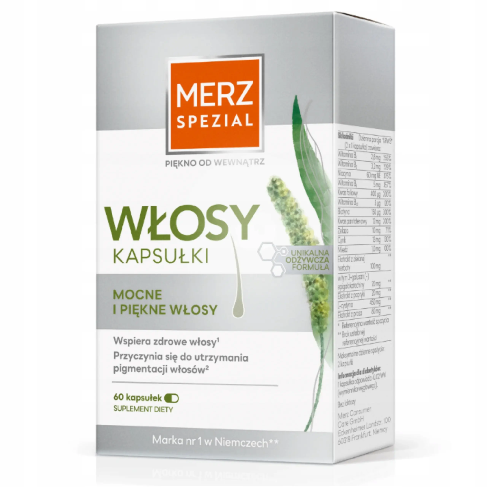 Merz Spezial Hair Capsules to suplement diety w formie kapsułek, zawierający starannie dobrane składniki, które mają na celu wspieranie zdrowia włosów oraz wpływanie na ich kondycję, gęstość i wygląd. Produkt dostarcza niezbędne witaminy i minerały, takie jak biotyna, cynk i żelazo, które pomagają w utrzymaniu prawidłowego stanu włosów, wspierając ich wzrost i wytrzymałość. Preparat jest przeznaczony dla osób dorosłych, które borykają się z problemem osłabionych, cienkich, rozdwajających się lub nadmiernie wypadających włosów, co może być wynikiem niedoborów żywieniowych.