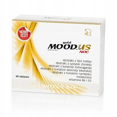 Suplement diety MOODUS Gold Noc to zestaw wysokiej jakości witaminowo – roślinnych składników, rekomendowany osobom rozdrażnionym, zestresowanym, które mają problemy ze snem. MOODUS GOLD NOC w swoim składzie zawiera ekstrakty z liści melisy lekarskiej, szyszek chmielu zwyczajnego, korzenia Ashwagandha, kwiatów lawendy lekarskiej oraz kwiatów rumianku pospolitego, a także witaminy B6, D3 i melatoninę. Melatonina pomaga w skróceniu czasu potrzebnego na zaśnięcie - korzystne działanie występuje w przypadku spożycia 1 mg melatoniny krótko przed pójściem spać. Co więcej, melatonina pomaga w łagodzeniu subiektywnego odczucia zespołu nagłej zmiany strefy czasowej - korzystne działanie występuje w przypadku spożywania 0,5 mg krótko przed pójściem spać pierwszego dnia podróży i przez kolejne kilka dni po przybyciu do celu podróży. Dodatkowo, witamina B6 przyczynia się do zmniejszenia uczucia zmęczenia i znużenia oraz pomaga w prawidłowym funkcjonowaniu układu nerwowego. Co więcej, witamina B6 wraz z witaminą D pomagają w prawidłowym funkcjonowaniu układu odpornościowego.