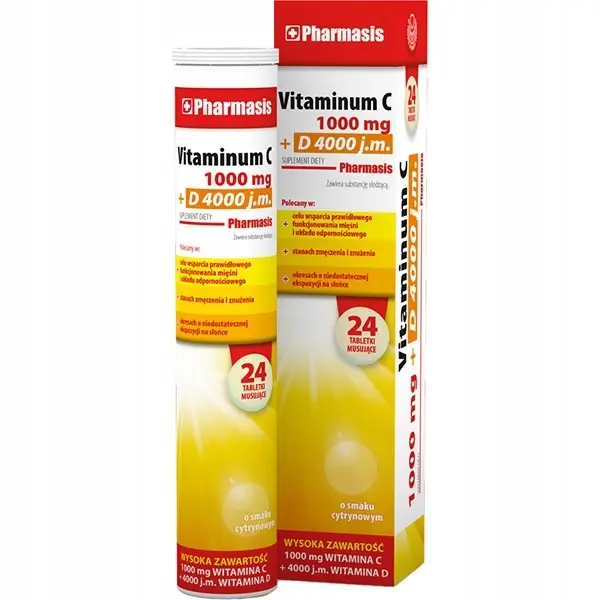 Pharmasis Vitaminum C 1000 mg + D 4000 j.m. to zaawansowany suplement diety stworzony z myślą o osobach poszukujących bezkompromisowego wsparcia dla swojego organizmu. Ten preparat w formie tabletek musujących łączy w sobie uderzeniowe dawki dwóch kluczowych witamin, które są fundamentem zdrowej odporności i witalności, szczególnie w okresach jesienno-zimowych oraz przy niedostatecznej ekspozycji na słońce.