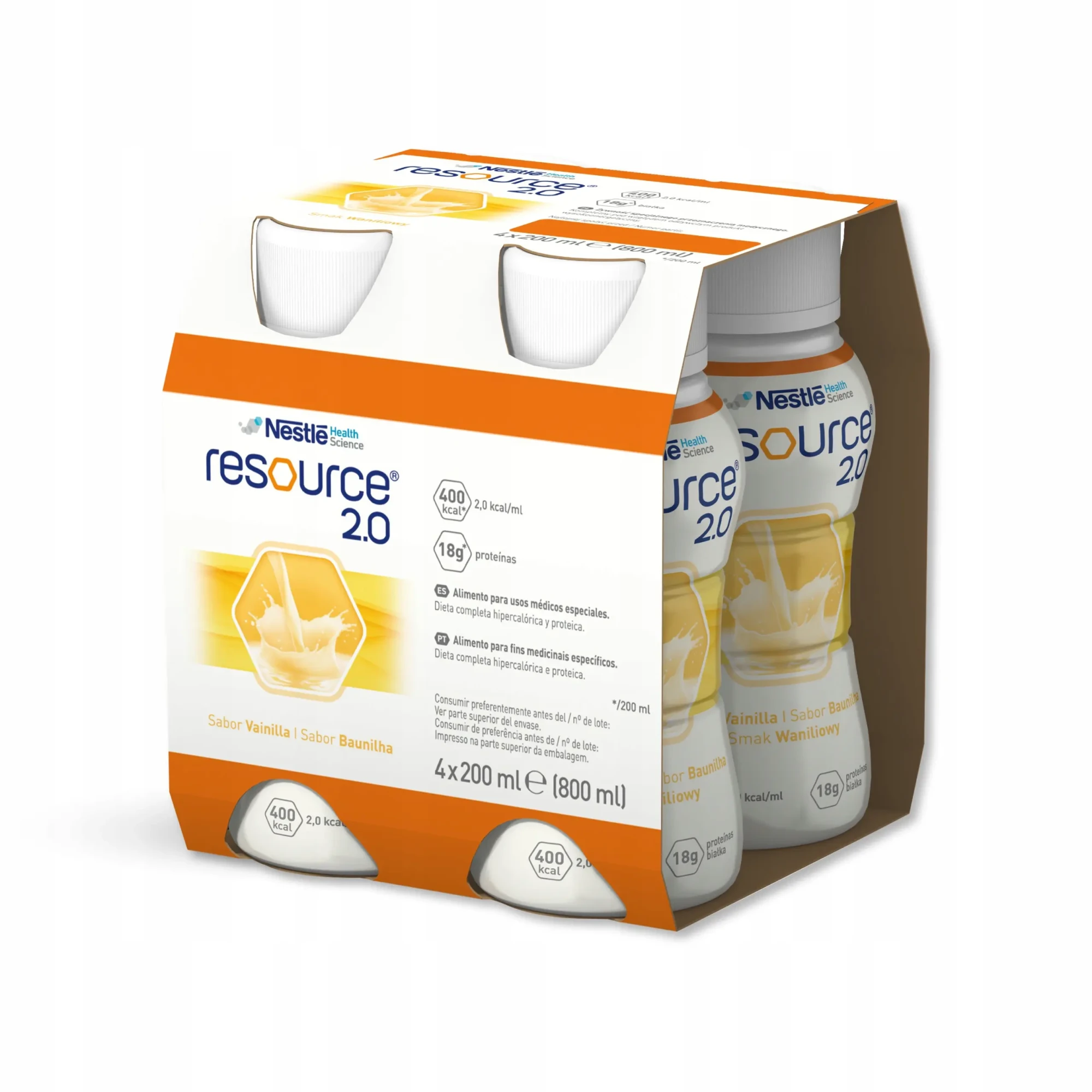 Resource 2.0 to kompletny pod względem odżywczym, wysokoenergetyczny napój w płynie. Każda butelka zawiera 400 kcal i 18g białka, z czego 15% stanowi białko serwatkowe. Produkt jest bezglutenowy i ma niską osmolarność 520 mOsm/l, co zapewnia dobrą tolerancję żywienia.