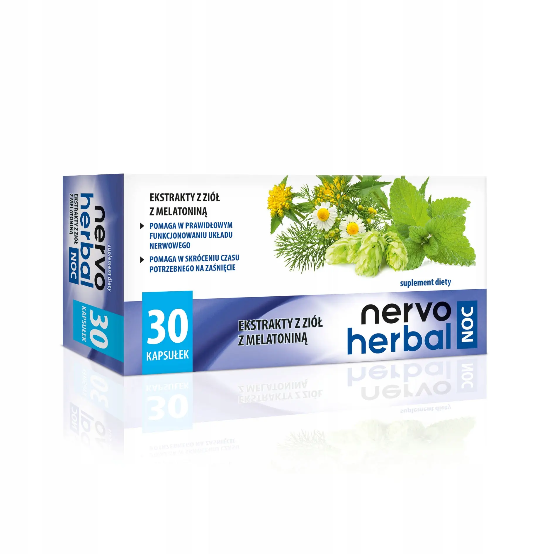 NervoHerbal Noc zawiera w swoim składzie ekstrakt z szyszek chmielu, ekstrakt z ziela melisy lekarskiej, ekstrakt z ziela męczennicy cielistej oraz melatoninę. NervoHerbal Noc to suplement diety, który pomaga w prawidłowym funkcjonowaniu układu nerwowego oraz pomaga w skróceniu czasu potrzebnego na zaśnięcie.