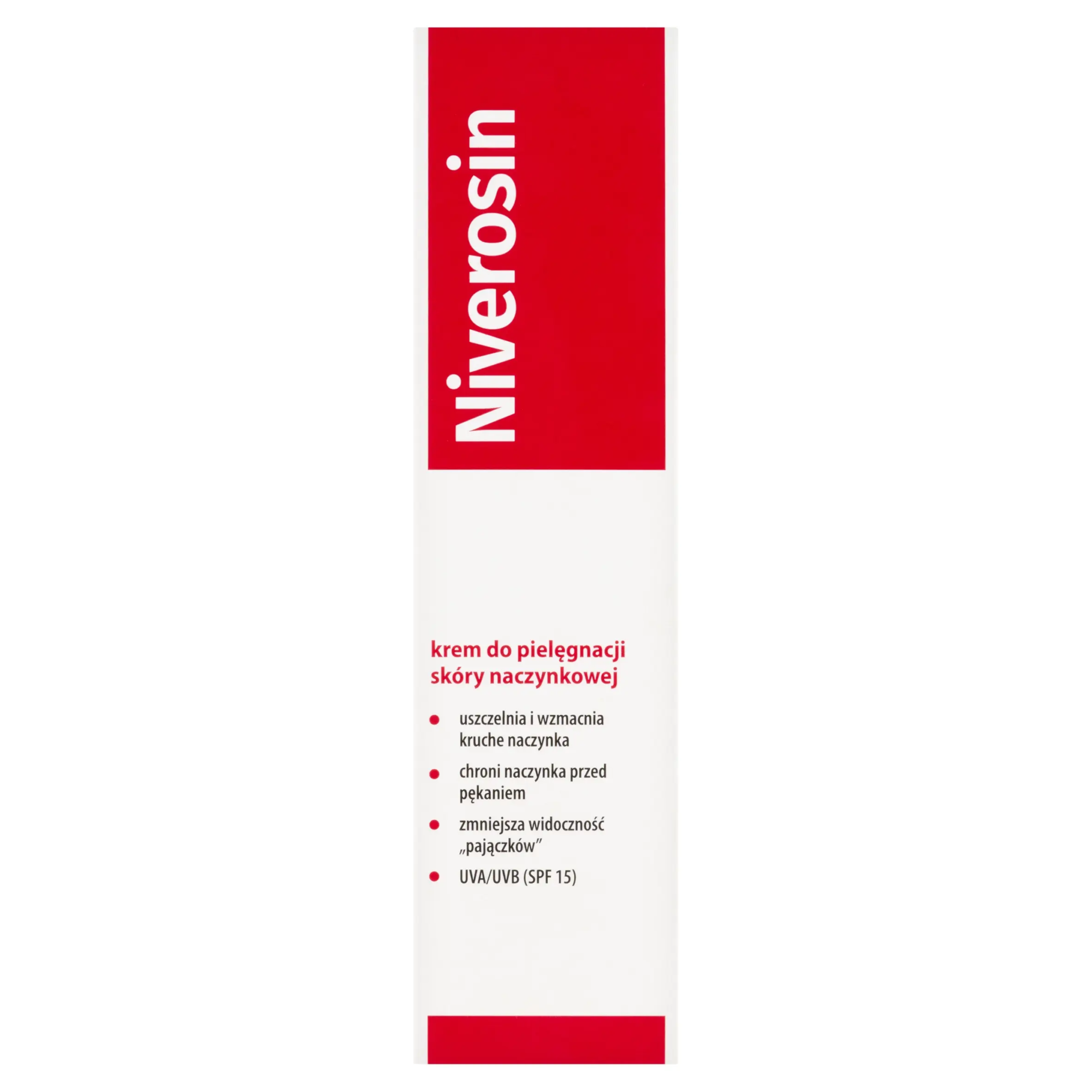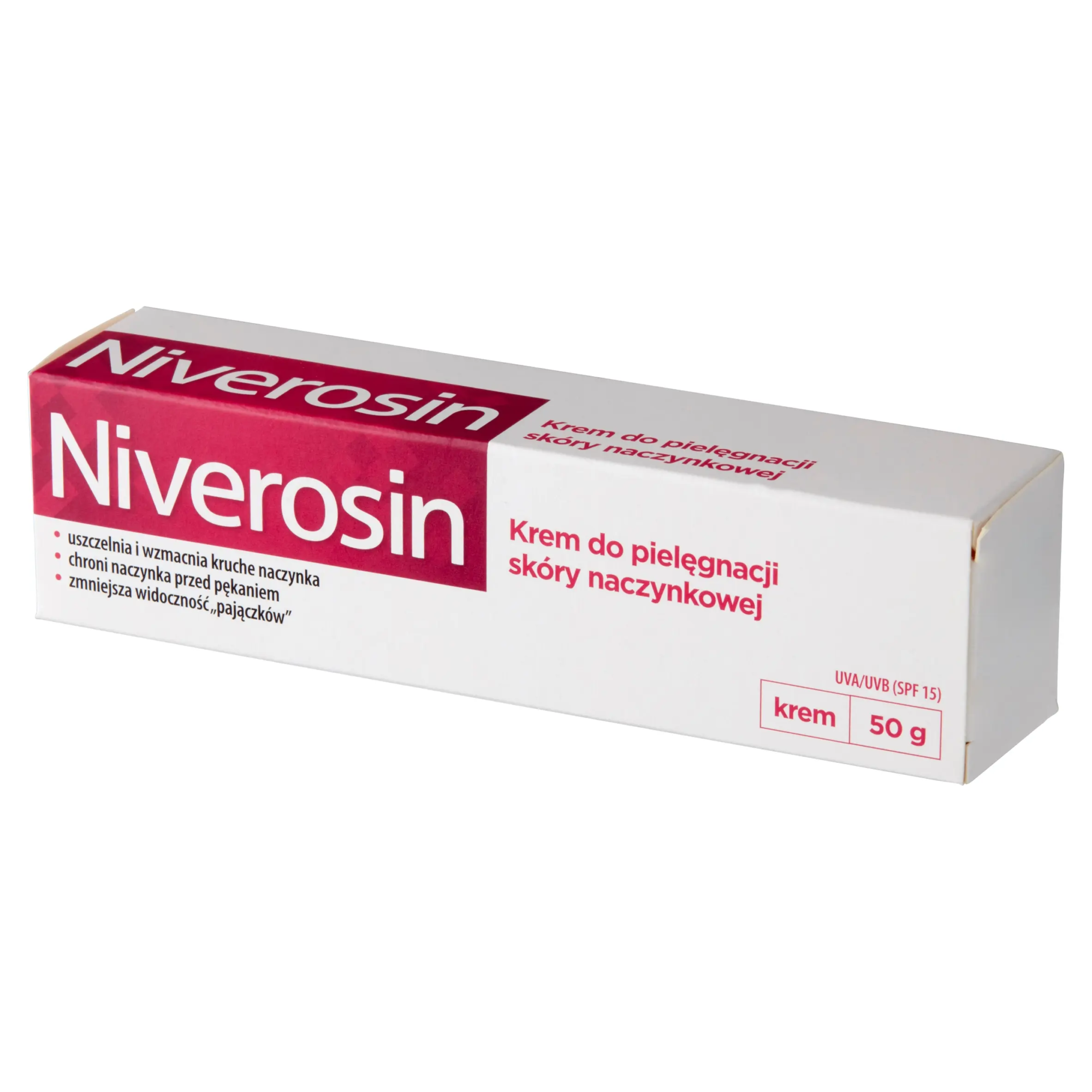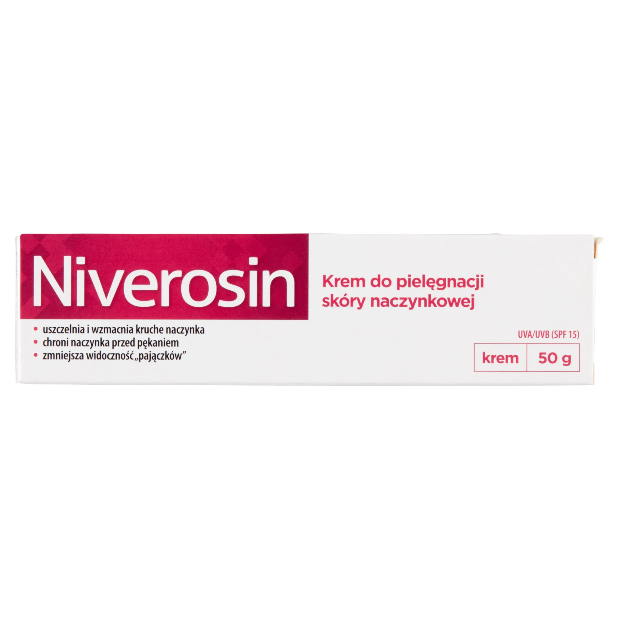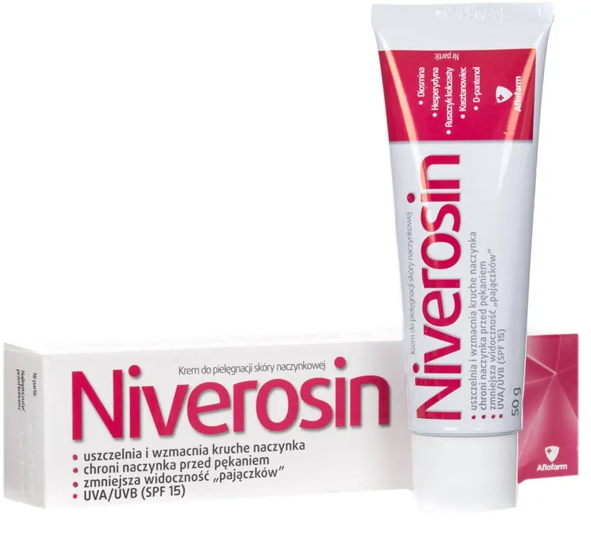 Niverosin to specjalistyczny preparat przeznaczony do kompleksowej pielęgnacji skóry z problemami naczynkowymi. Dzięki zawartości kompleksu bioflawonoidów (diosmina, hesperydyna), wzbogaconego o wyciąg z kasztanowca, ruszczyk kolczasty i D-pantenol, krem Niverosin uszczelnia i wzmacnia kruche naczynka, chroni je przed „pękaniem” oraz zmniejsza widoczność „pajączków”. Dodatkowo filtr SPF 15 chroni skórę przed działaniem promieni słonecznych (UVA/UVB). Systematyczna pielęgnacja za pomocą kremu Niverosin wspomaga utrzymanie prawidłowych funkcji fizjologicznych skóry oraz zachowanie odpowiedniego napięcia i elastyczności naczyń występujących w jej powierzchniowych warstwach.
