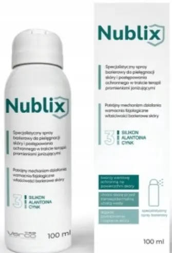 Silikonowy spray barierowy do pielęgnacji i ochrony skóry narażonej na działanie promieniowania jonizującego. Zalecany jest do codziennego użycia od pierwszego dnia napromieniania przez cały okres terapii. Nublix przeznaczony jest do skóry ciała (z wyłączeniem błon śluzowych). Pozostawia na skórze delikatną warstwę ochronną bez jej nadmiernego obciążania. Synergistyczny mechanizm działania zapewnia skórze kompleksową ochronę i wzmocnienie procesów naprawczych skóry. Produkt kosmetyczny redukuje zaczerwienienie i napięcie skóry. Bezzapachowa, transparentna formuła sprayu silikonowego równomiernie rozprowadza się na skórze, co sprzyja szybkiemu wysychaniu również na owłosionych partiach ciała u mężczyzn.