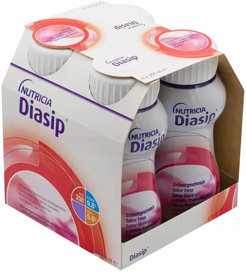 Żywność specjalnego przeznaczenia medycznego. Do postępowania dietetycznego w niedożywieniu związanym z chorobą u pacjentów z cukrzycą i pacjentów z hiperglikemią. Zawiera cukry i substancje słodzące. Diasip jest produktem zawierającym błonnik, kompletnym pod względem odżywczym.