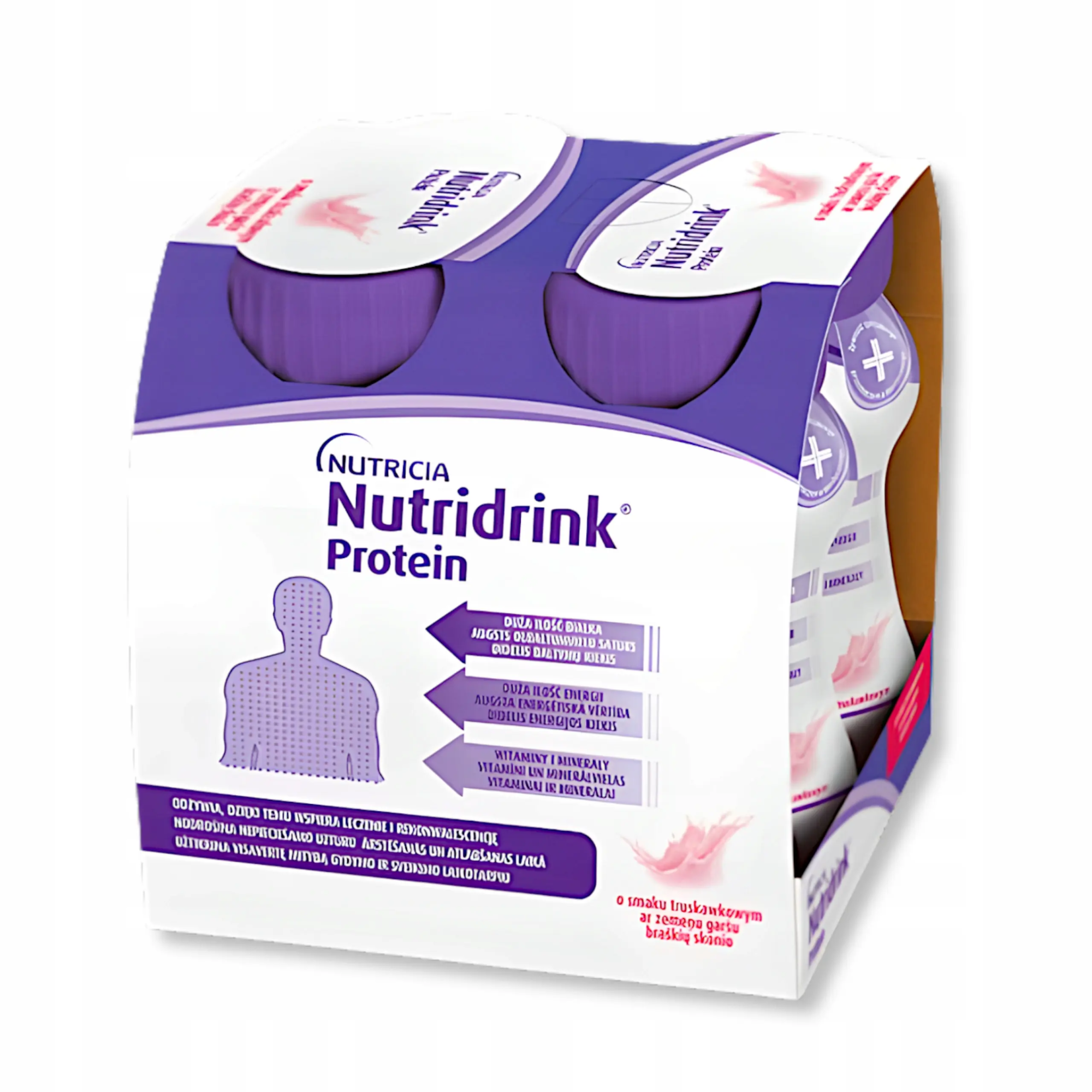 Nutridrink Protein o smaku truskawkowym: białka mleka krowiego, woda, maltodekstryna, sacharoza, oleje roślinne (olej rzepakowy, olej słonecznikowy), wodorofosforan magnezu, emulgator (lecytyny (lecytyna sojowa)), aromat, chlorek choliny, barwnik (karmin), cytrynian potasu, L-askorbinian sodu, wodorofosforan dipotasu, mleczan żelaza(II), octan DL-alfa-tokoferylu, glukonian miedzi(II), siarczan cynku, siarczan manganu, D-pantotenian wapnia, chlorowodorek tiaminy, chlorowodorek pirydoksyny, nikotynamid, ryboflawina, octan retinylu, fluorek sodu, kwas pteroilomonoglutaminowy, chlorek chromu(III), jodek potasu, molibdenian(VI) sodu, selenian(IV) sodu, D-biotyna, fitomenadion, cholekalcyferol, cyjanokobalamina.