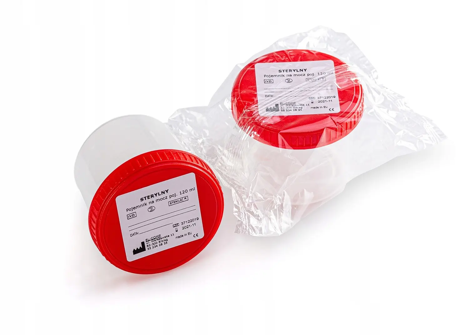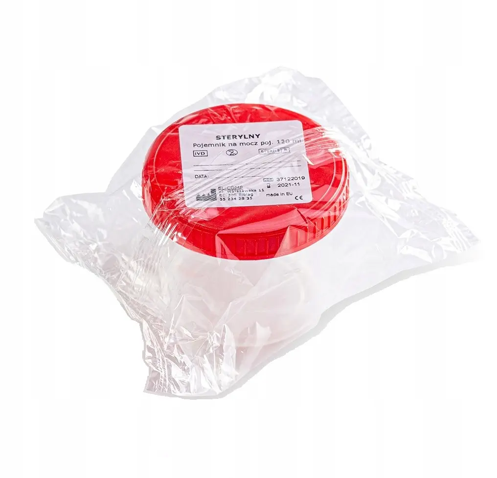 - STERYLNY pojemnik do badania moczu o pojemności 120 ml zakręcany.