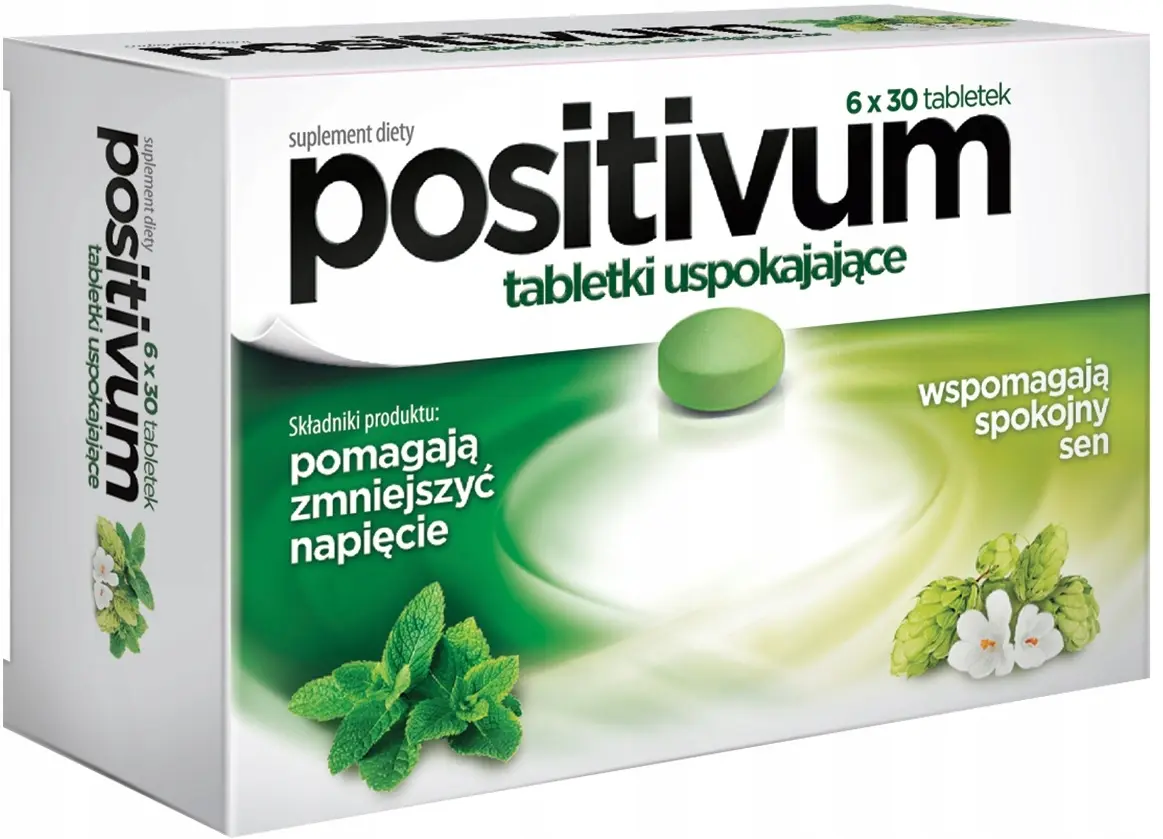 Positivum tabletki uspokajające - suplement diety zawierający składniki wspomagające zmniejszenie napięcia oraz wspierające spokojny sen. Produkt przeznaczony dla osób dorosłych.