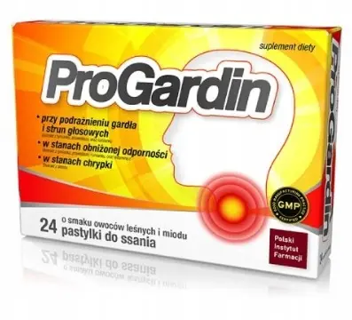 ProGardin - suplement diety w postaci pastylek do ssania o smaku owoców leśnych i miodu. Produkt przeznaczony dla dzieci powyżej 6 roku życia i dorosłych.
