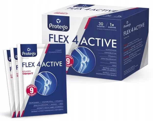 Protego FLEX 4Active to suplement diety w postaci proszku w saszetce o smaku pomarańczowym. Wspiera prawidłowe funkcjonowanie stawów. Zawiera 9 aktywnych składników, m.in. hydrolizowany kolagen Colpropur D®, glukozaminę, chondroitynę, kwas hialuronowy oraz ekstrakty z żywicy kadzidłowca i kłącza imbiru.